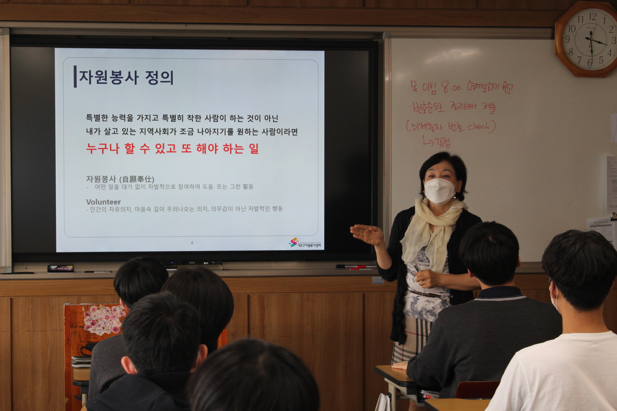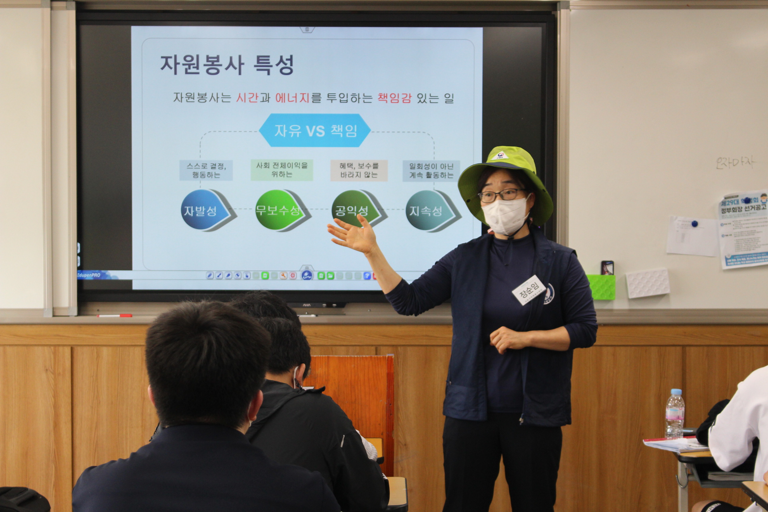 이어서 자원봉사의 정의/의미의 변화/자원봉사의 특성/청소년들이 자원봉사에 참여하는 방법 을 강의하며