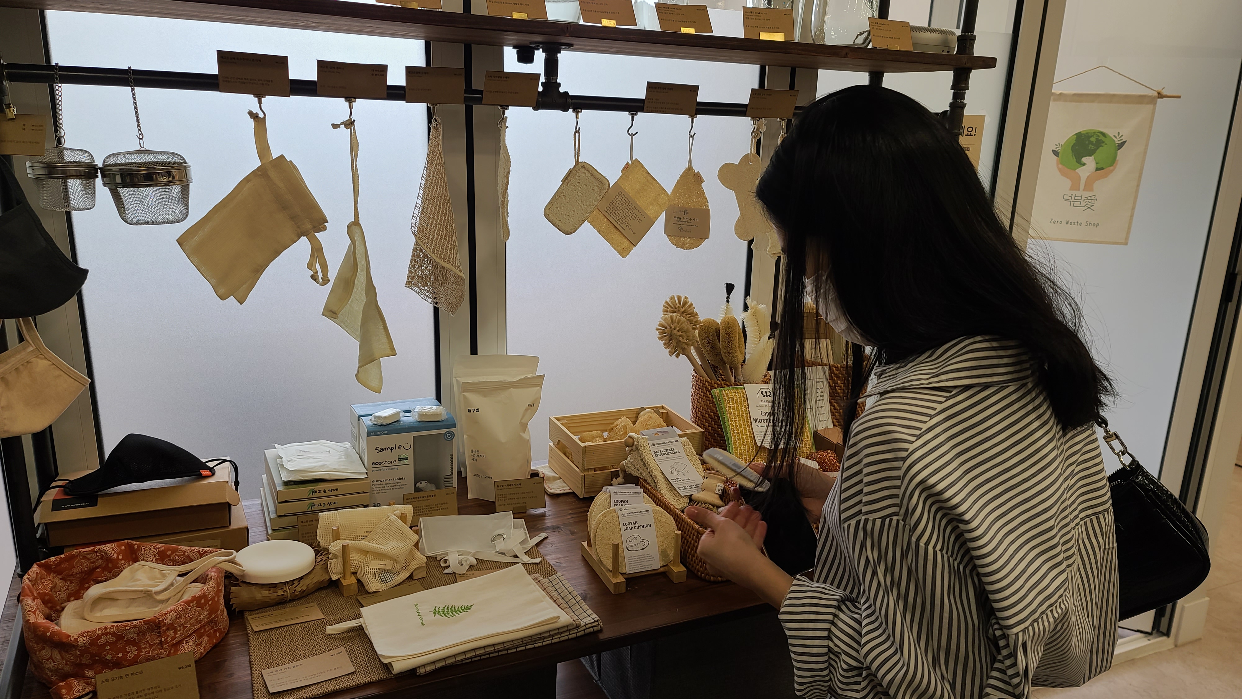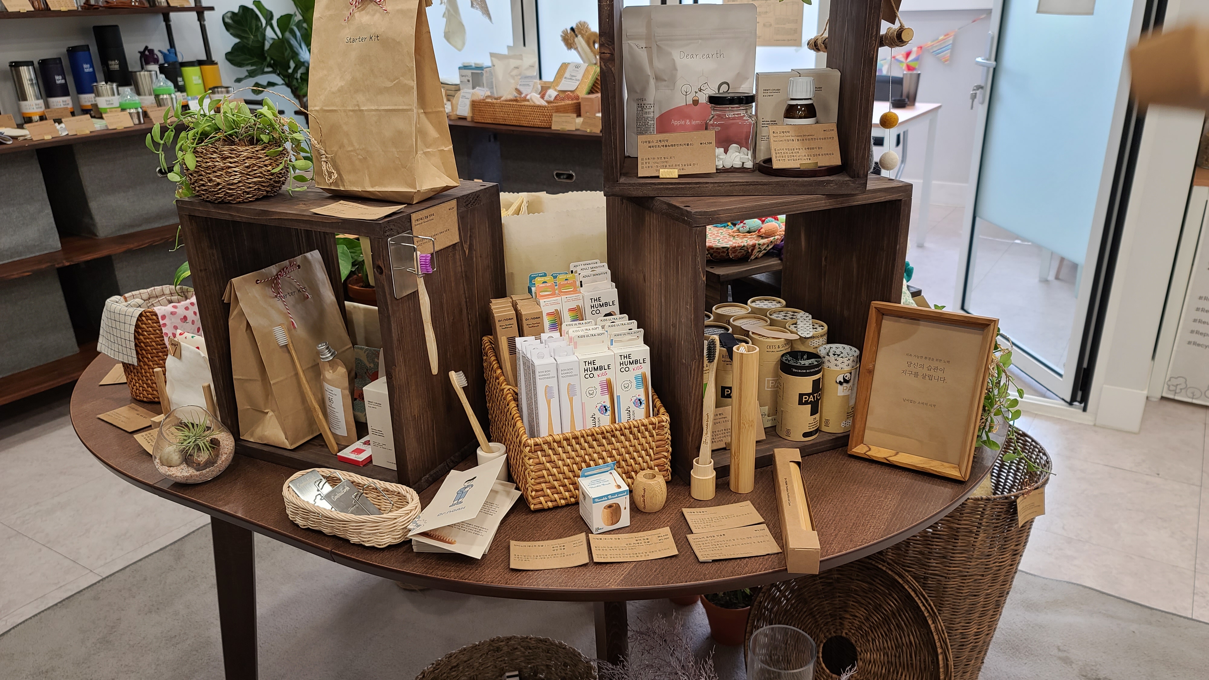 리필 스테이션 옆에는 일상생활에서 사용할 수 있는 친환경 제품들이 진열되어 있었습니다.