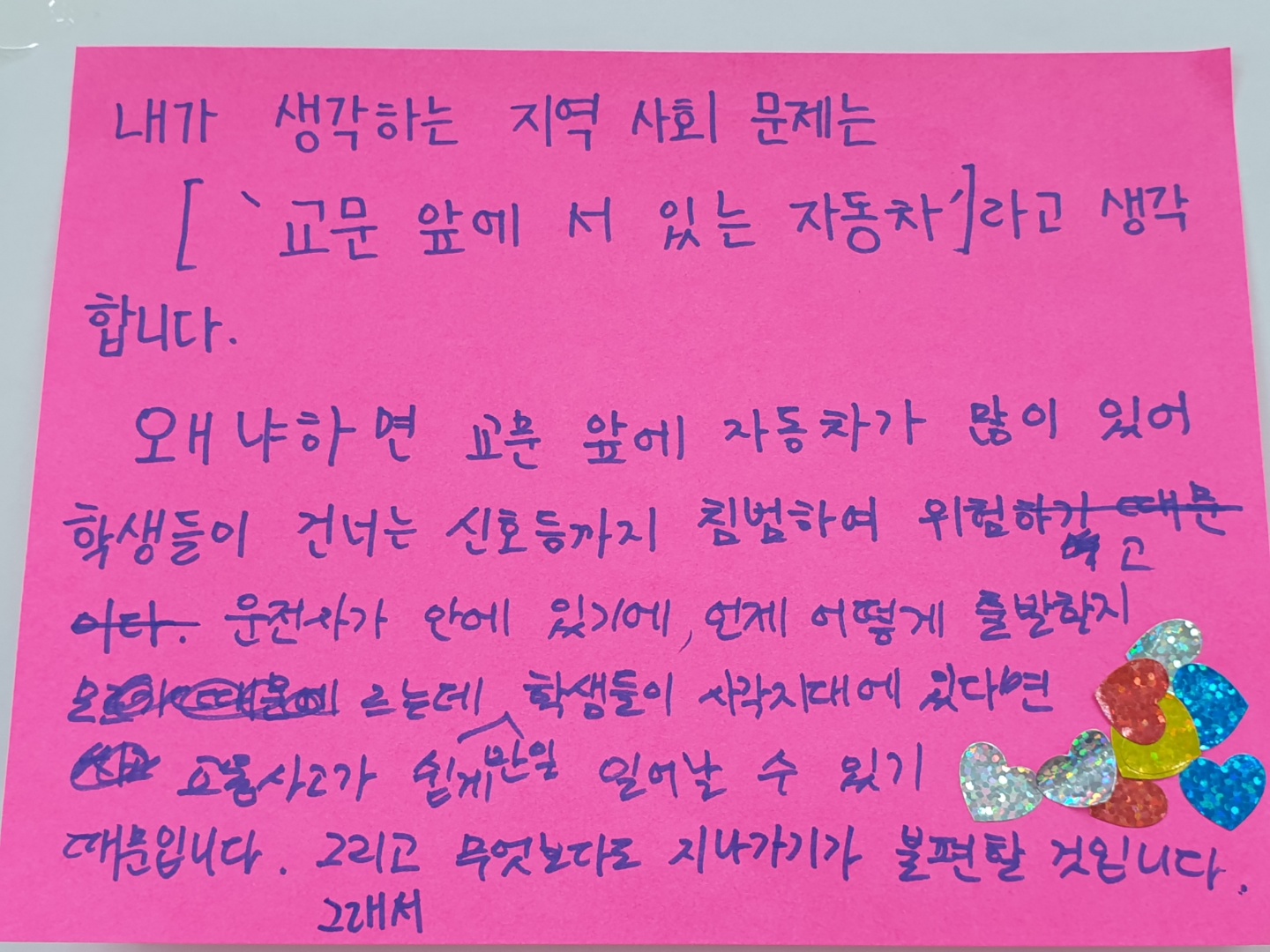 학생들이 학교안에서 우리지역의 이슈에 대한 봉사활동 프로그램을