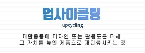 우리는 저번 ‘제로웨이스트’ 편을 통해 쓰레기를 최소화하는 것에 대해 생각해보았어요! 그런데,,, 문득 이미 발생한 쓰레기는 어떻게 하는 것이 좋을까? 라는 생각이 들게 되었습니다. 그래서 쓰레기를 재활용할 수 있는 방법이 무엇이 있을지 열심히 생각해보면서 떠오른 것이 바로바로 ‘업사이클링’입니다!