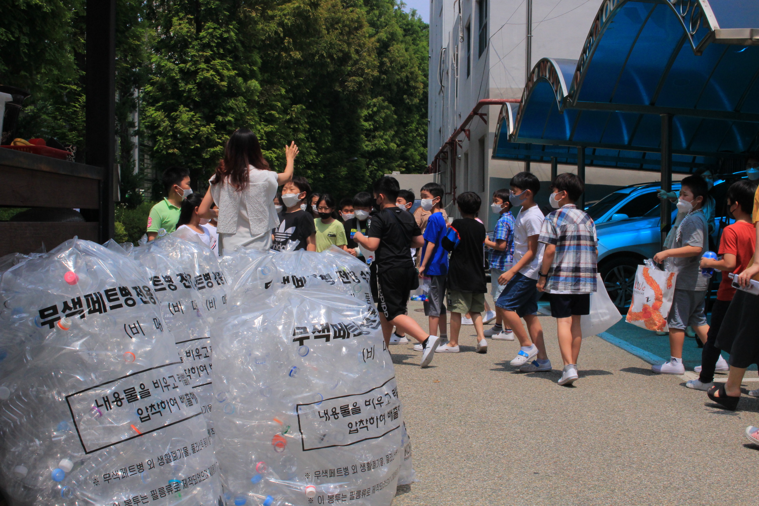 양재초등학교에서 학생들이 그동안 직접 분리수거한 플라스틱들을 모으는 날이라고 하여