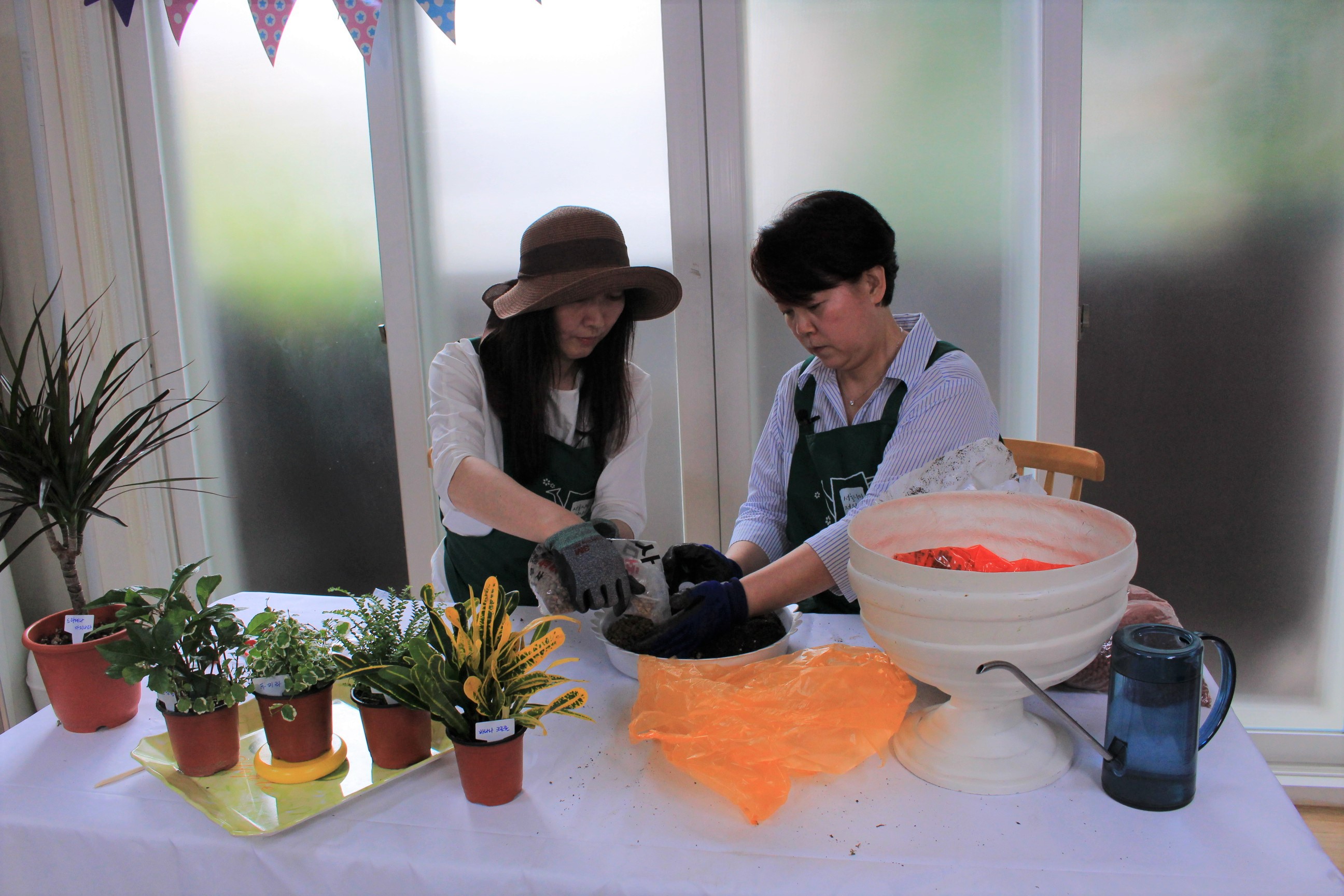 분갈이 과정을 상세히 알려주시는 손은영 단장님과 변경란 활동가님의 모습입니다. 분갈이 화분 사이즈는 모종보다 한 두 단계 큰 것으로 준비하는 것이 좋다고 합니다. 그리고 분갈이를 했다면 물을 주어야겠지요? ㅎㅎ물주기에서 가장 중요한 것은 물 주는 시점인데요, 나무픽을 흙 가운데에 꽂은 후 픽이 3분의 1 정도 젖어있으면 물을 다시 주면 된다는 꿀팁!