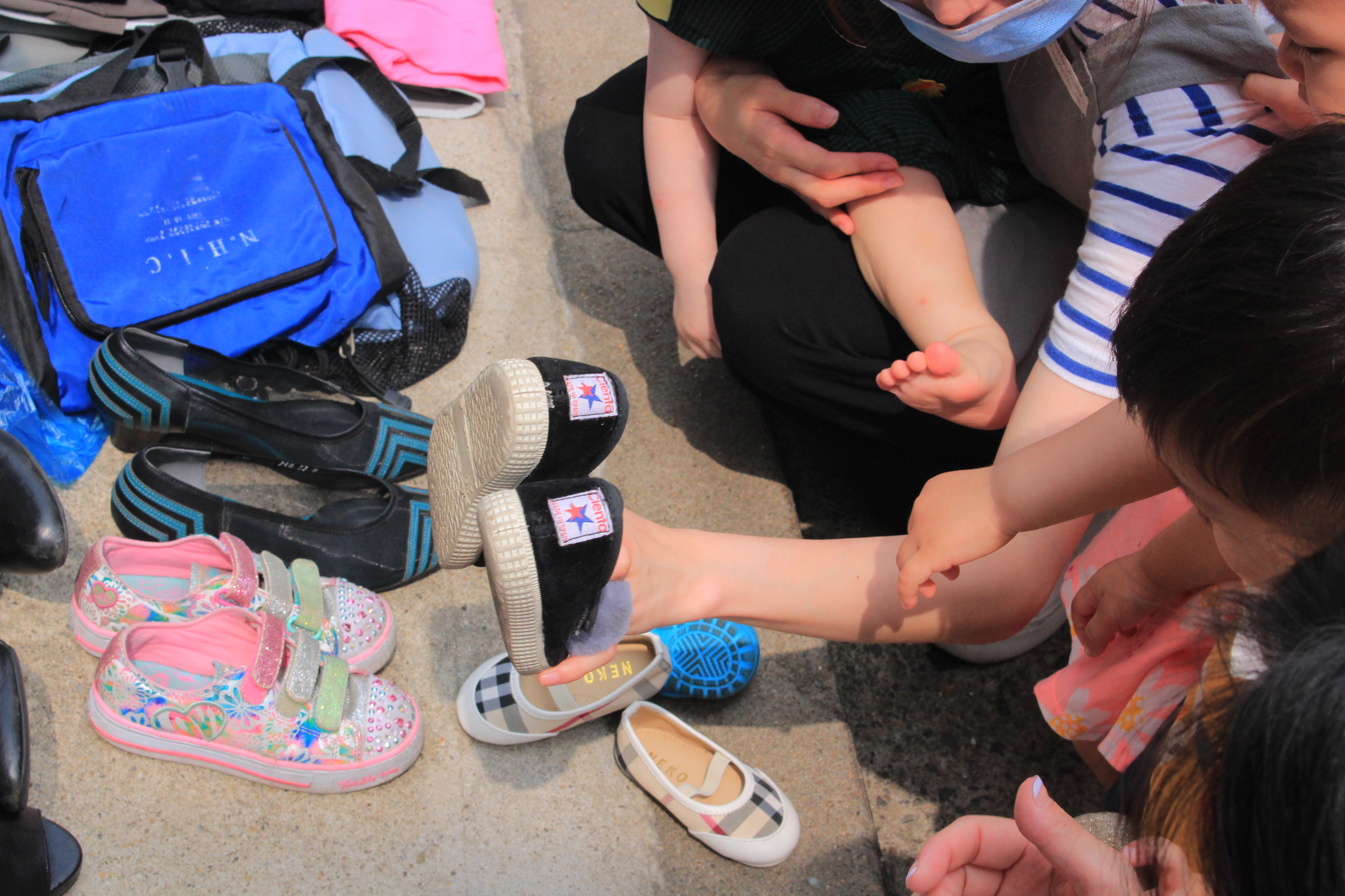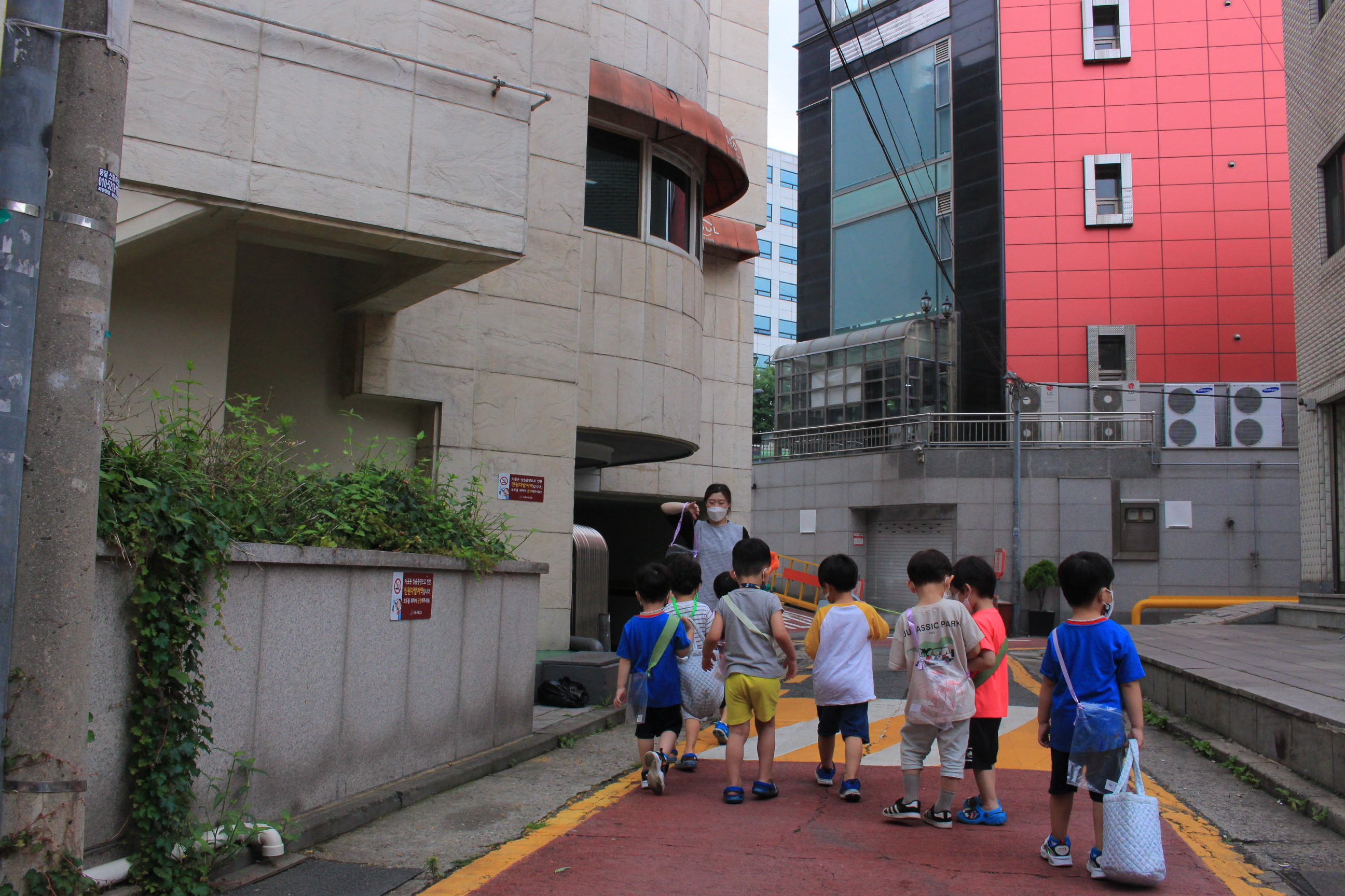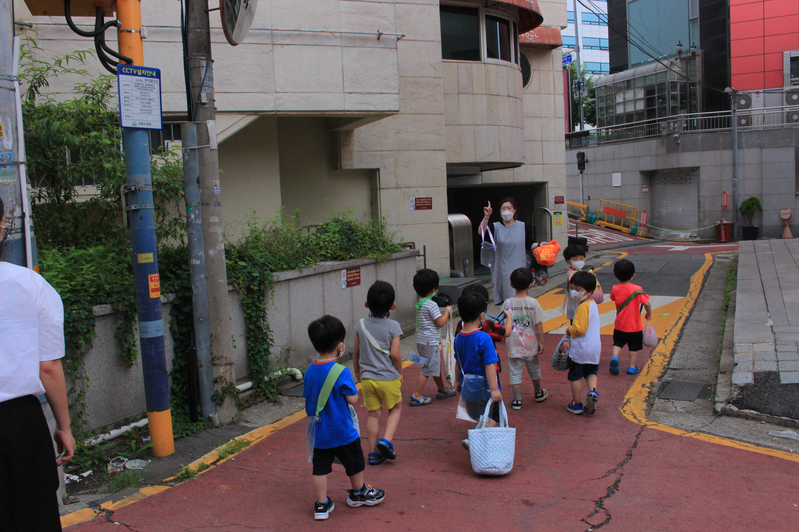 인근 어린이집에서 아이들이 장바구니를 들고 삼삼오오 나왔네요.