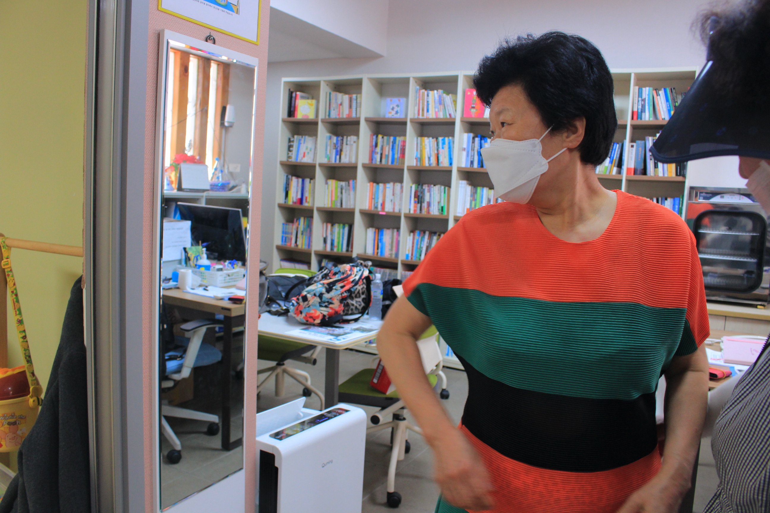 예쁜 원피스 하나 골랐다며 거울로 이리저리 비춰보며 만족해하는 주민모습에 봉사단들도 덩달아 신이 났답니다.