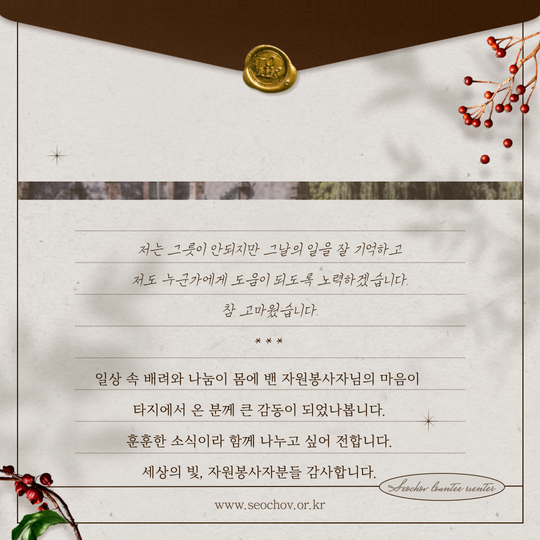 일상 속 배려와 나눔이 몸에 밴 자원봉사자님의 마음이 타지에서 온 분께 큰 감동이 되었나봅니다.