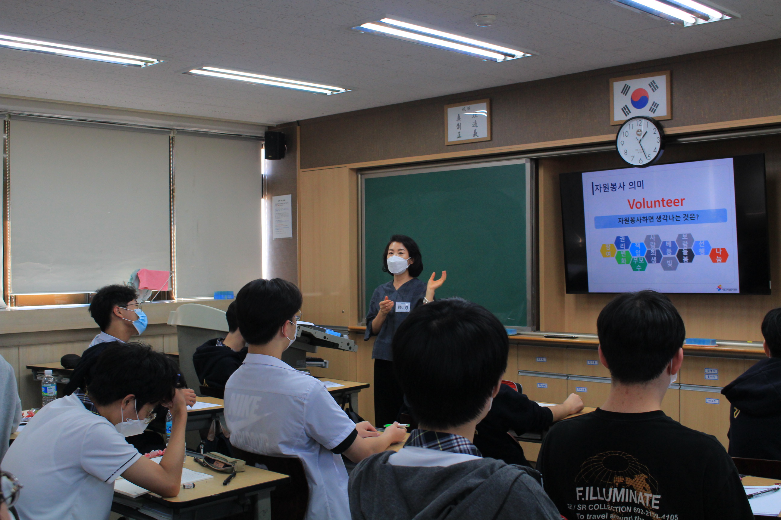 봉사의 개념부터 시작해, 봉사를 주제로 한 흥미로운 영상 컨텐츠와 프레젠테이션을 선보이셨는데요. 학생들의 눈높이에 맞게 봉사를 통해 만날 수 있는 진로 탐색 등 크게 도움이 될 알찬 수업이었습니다.