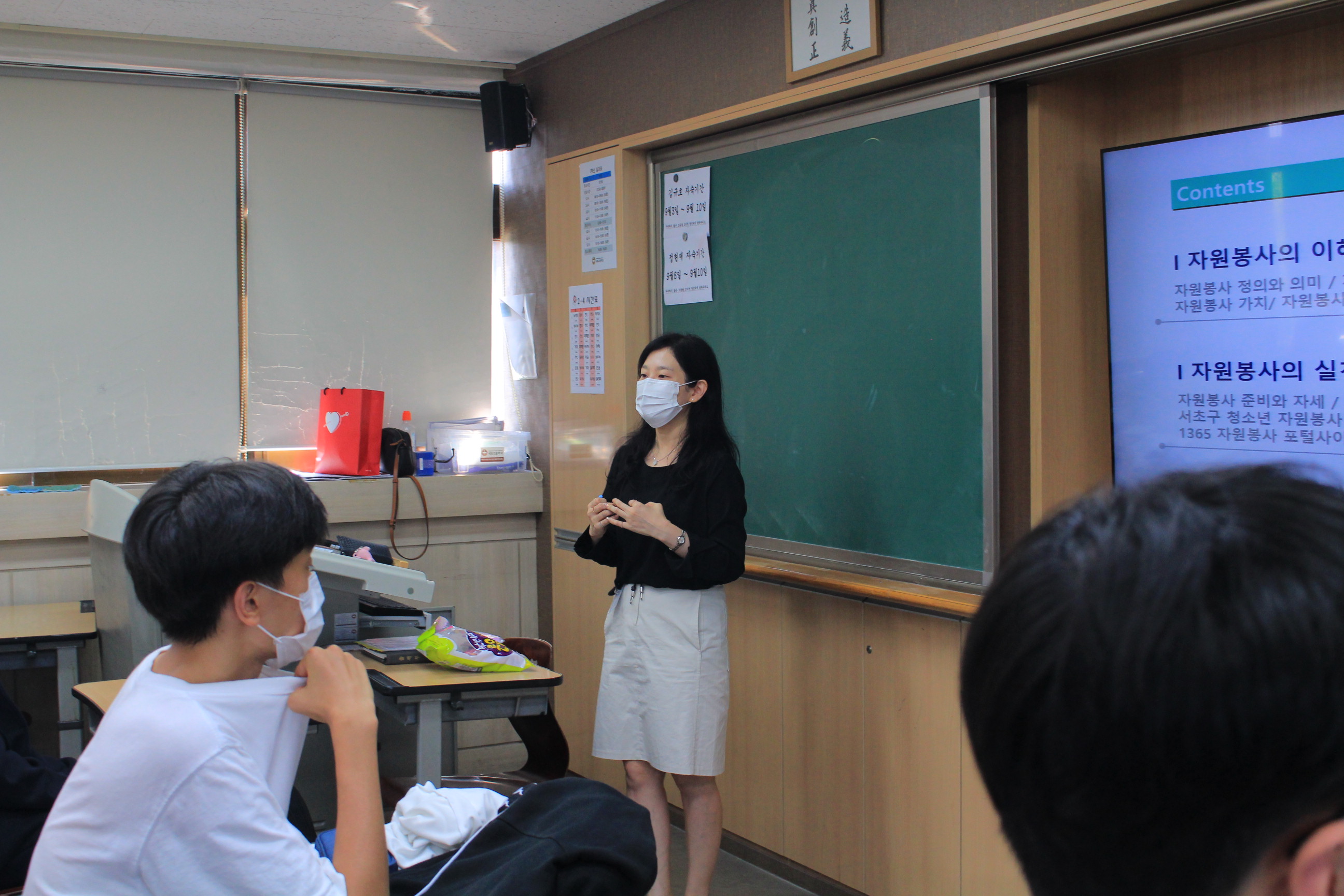 서초구자원봉사센터 직속 봉사 선생님들께서는 2학년 1반부터 11반까지 한 분씩 배치되어 ‘봉사’란 무엇인가에 대해 수업을 진행해주셨습니다.