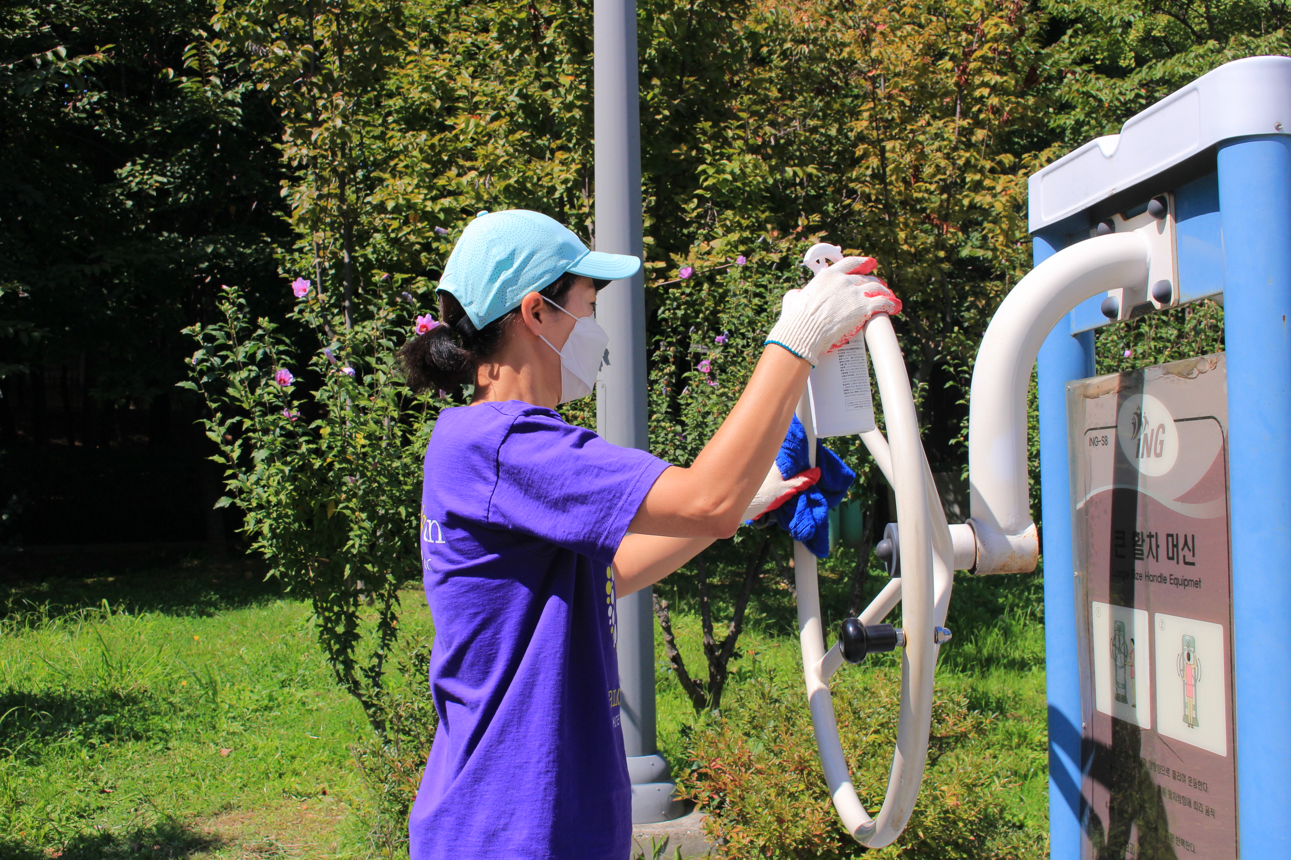 작업이 다 완료된 후 주변 벤치와 운동기구를 소독하는 시간도 가졌습니다.