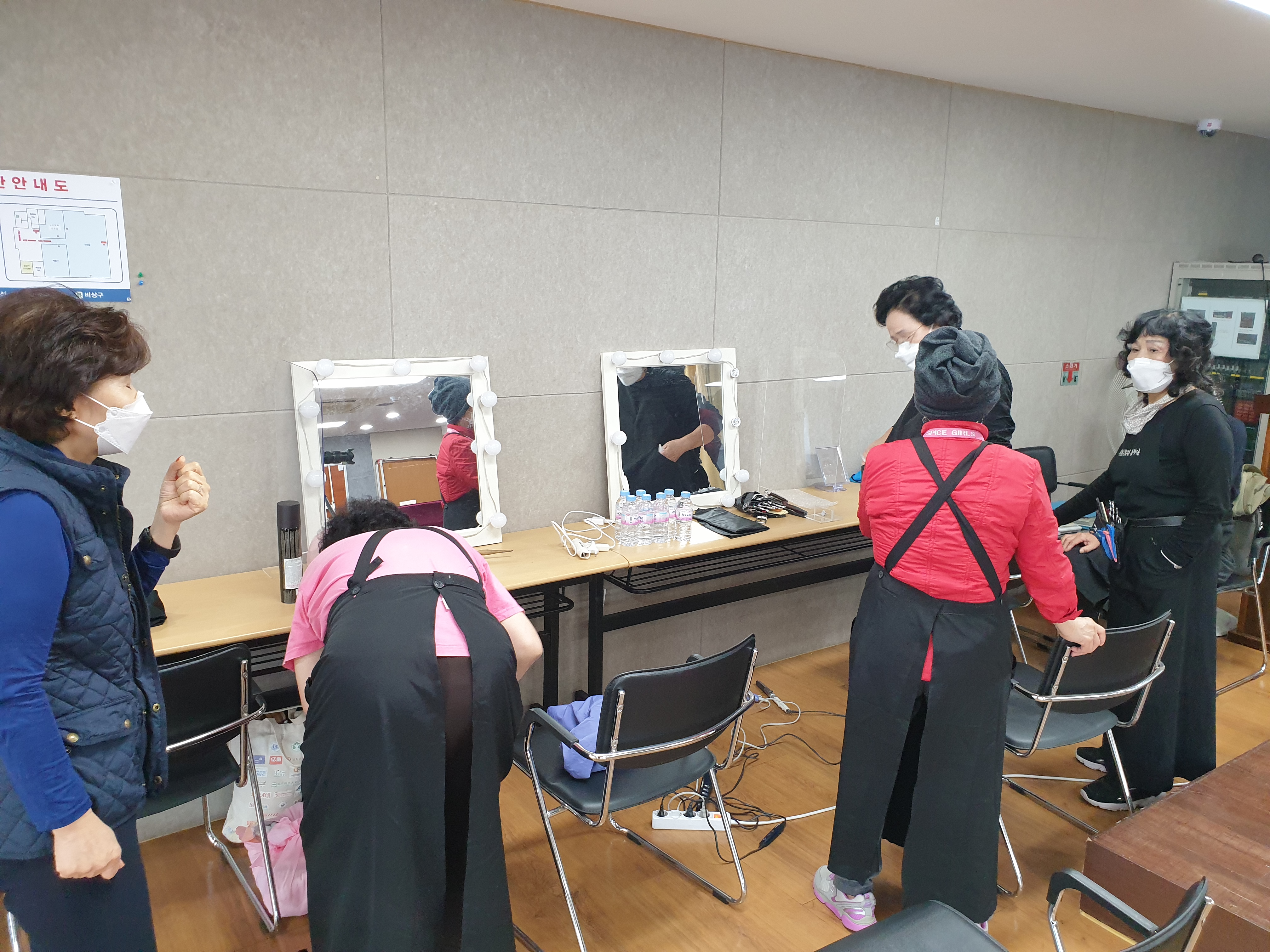 쨔잔~ 먼저 행복나누기봉사단(리더 노길자)입니다. 이미용을 담당하는 봉사단이고 서초문화원에서 이미용을 지도하시는 노길자 단장님과 그 제자분들, 그리고 현업에 계신 분들이 주축이 되어서 이미용을 진행하는 봉사단입니다. 이번 프로젝트에서는 어르신들의 이미용을 담당하여 아름답고 깨끗한 모습으로 촬영하실 수 있게 준비하고 있는 모습입니다.
