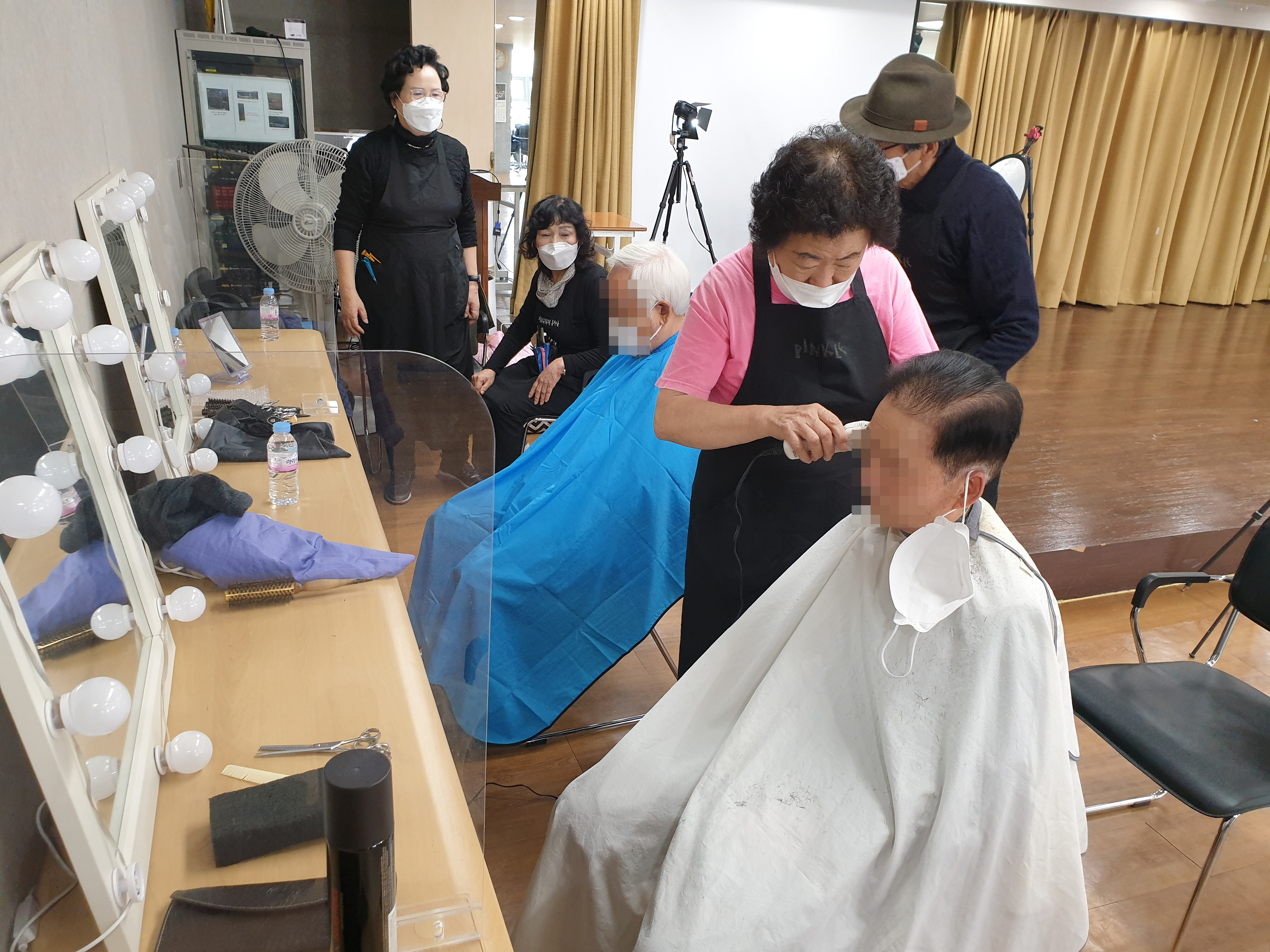 시간이 되어 어르신들이 한 분씩 오시면 정성스럽게 머리를 다듬거나 드라이를 해서 깨끗한 모습을 유지하게 다듬으십니다.
