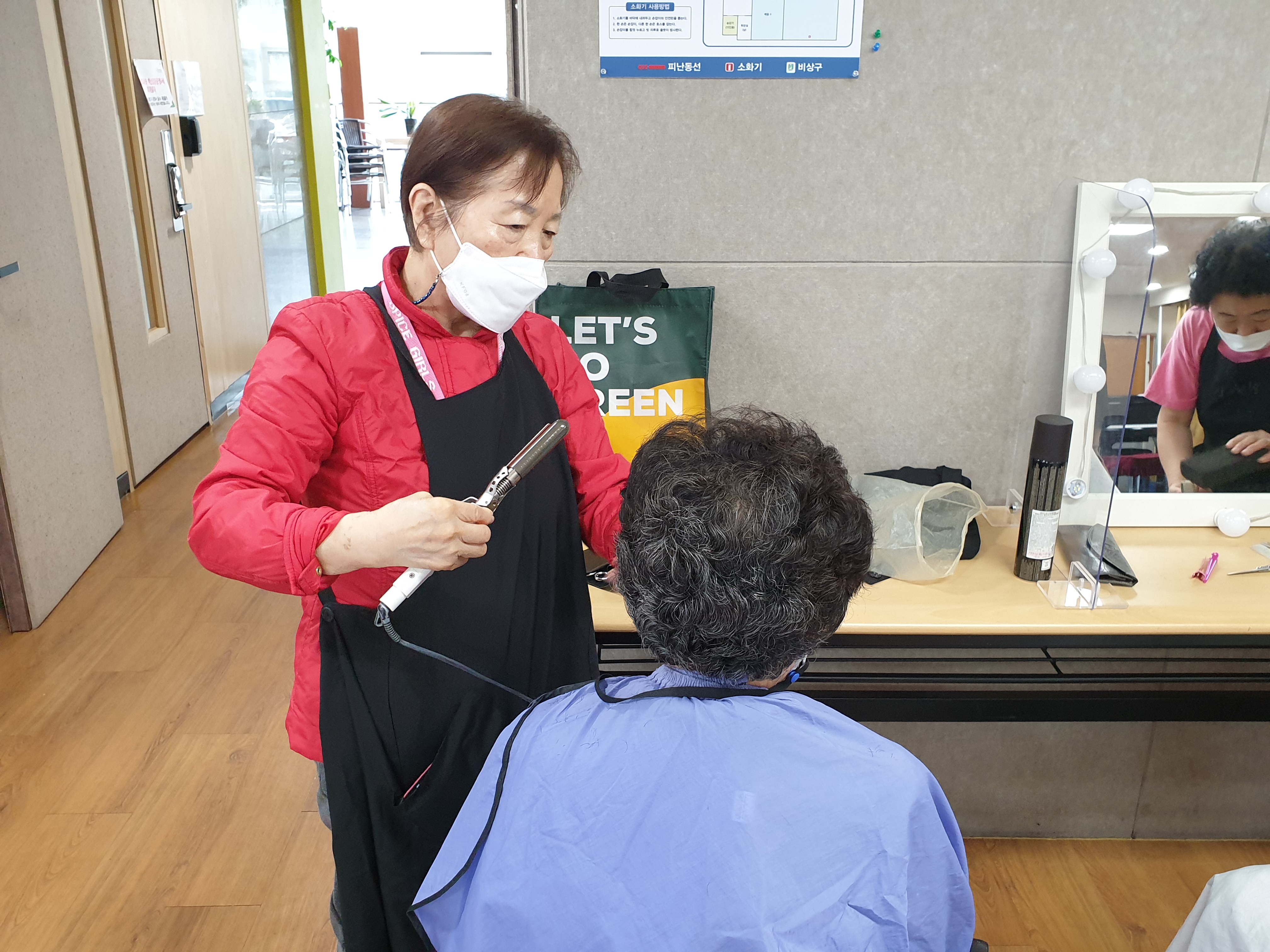노길자 단장님이 직접 고데기로 머리를 정리하시고 계십니다. 어르신들을 위한 세심한 정성이 보입니다.