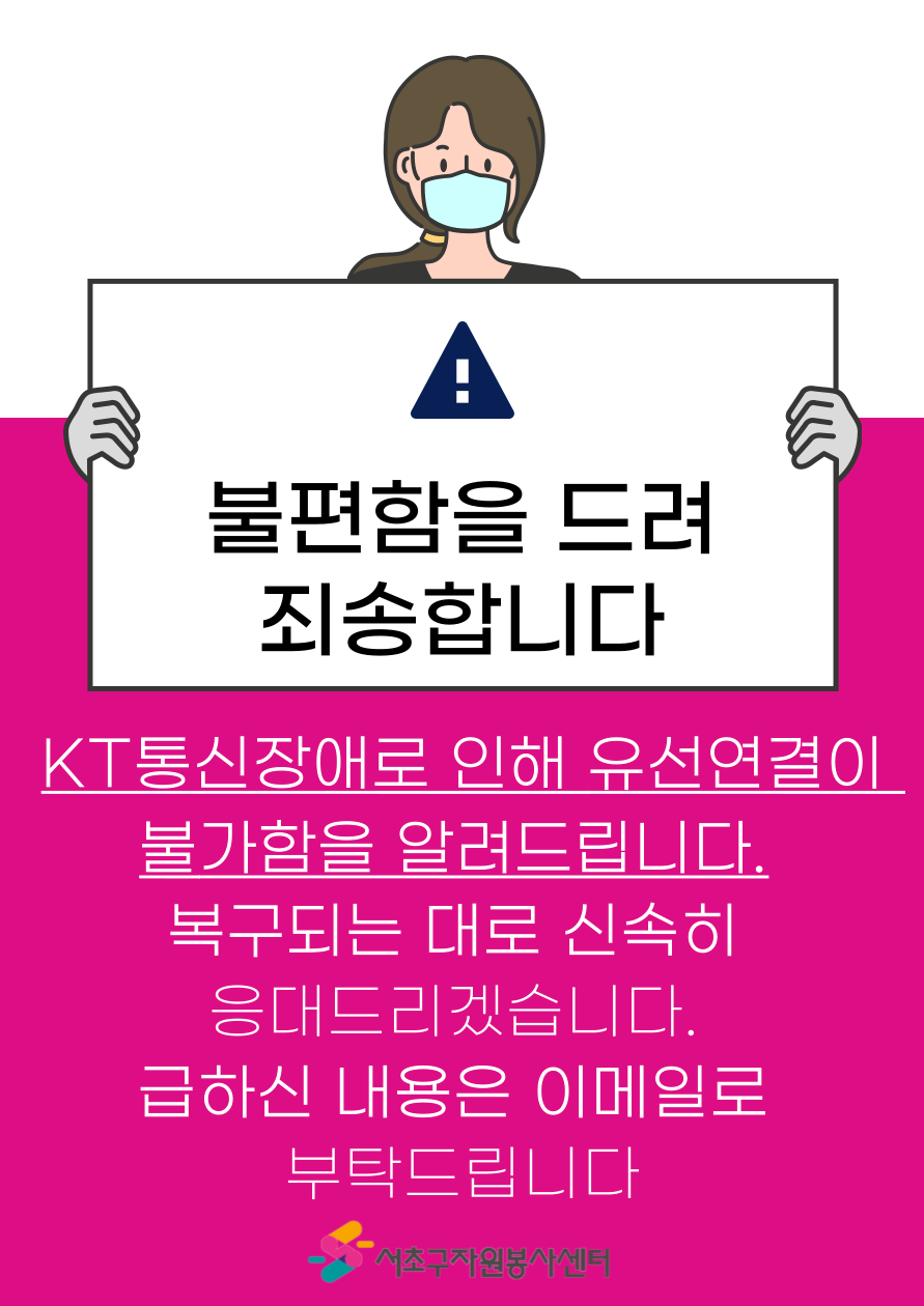 KT 전산장애로 인해 유선연결이 불가함을 안내드립니다.