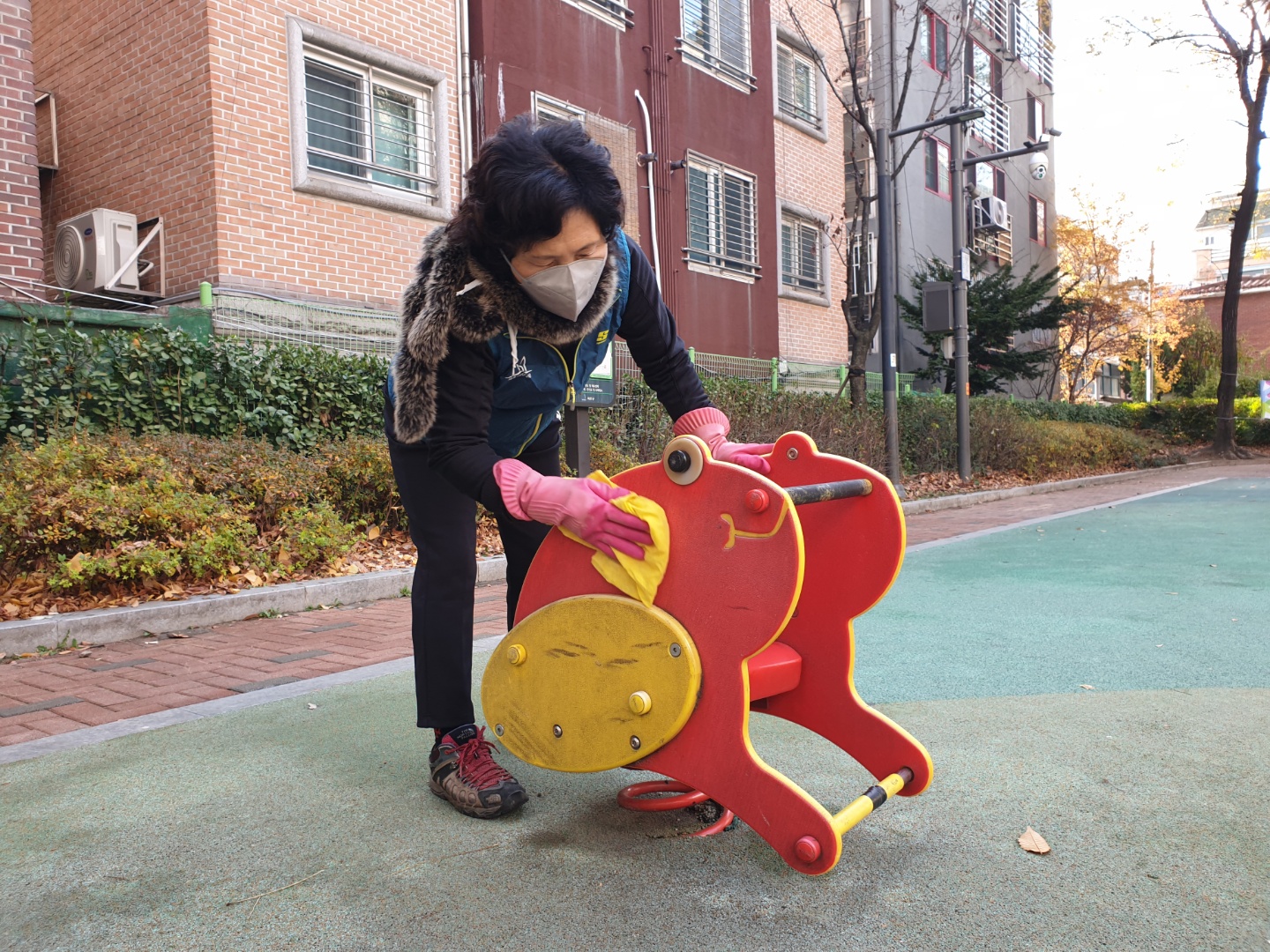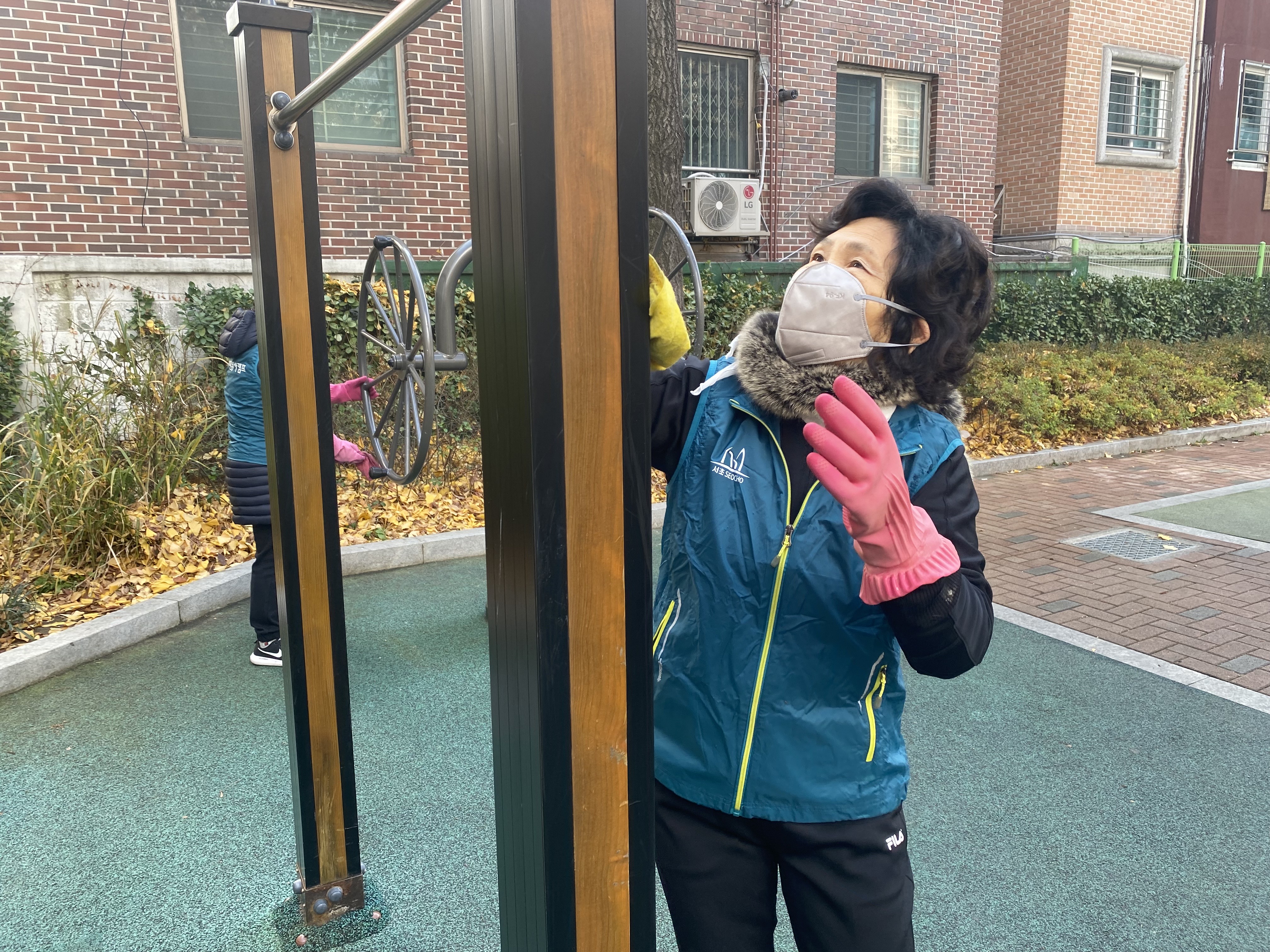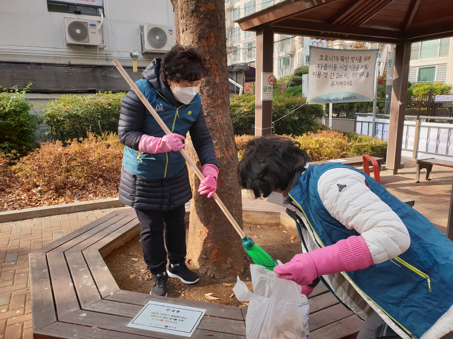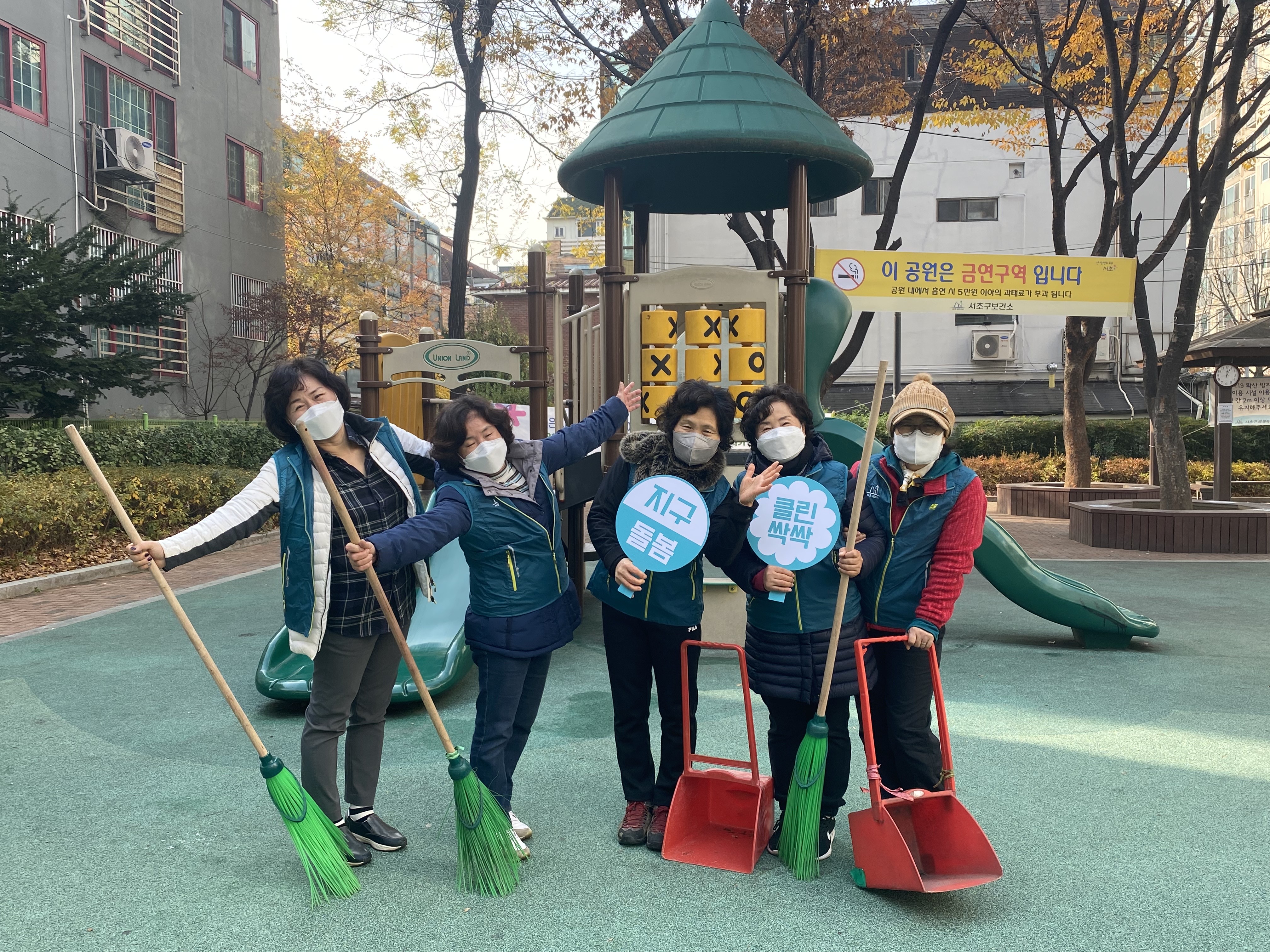 바로 오늘, 방배본동 5총사가 모여 새말어린이공원에서 낙엽 정리과 놀이기구, 운동기구 소독 등을 하였습니다.