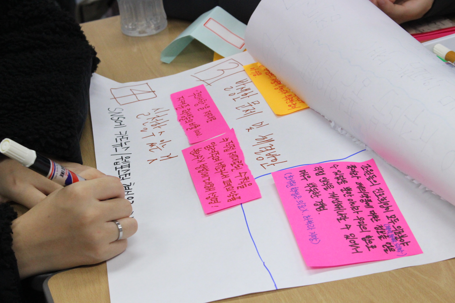 그 다음에는 4개의 조에서 조별 토론을 통해 각 1개의 이슈를 선정하고 전체 투표를 통해 1~2개의 이슈를 선정한 뒤 선정한 이슈에 대해 조마다 생각한 원인과 해결 방안을 발표했습니다. 마지막으로 전체 대표와 서기를 1명씩 선출하여 역할 분담을 하고 활동을 마무리했습니다.