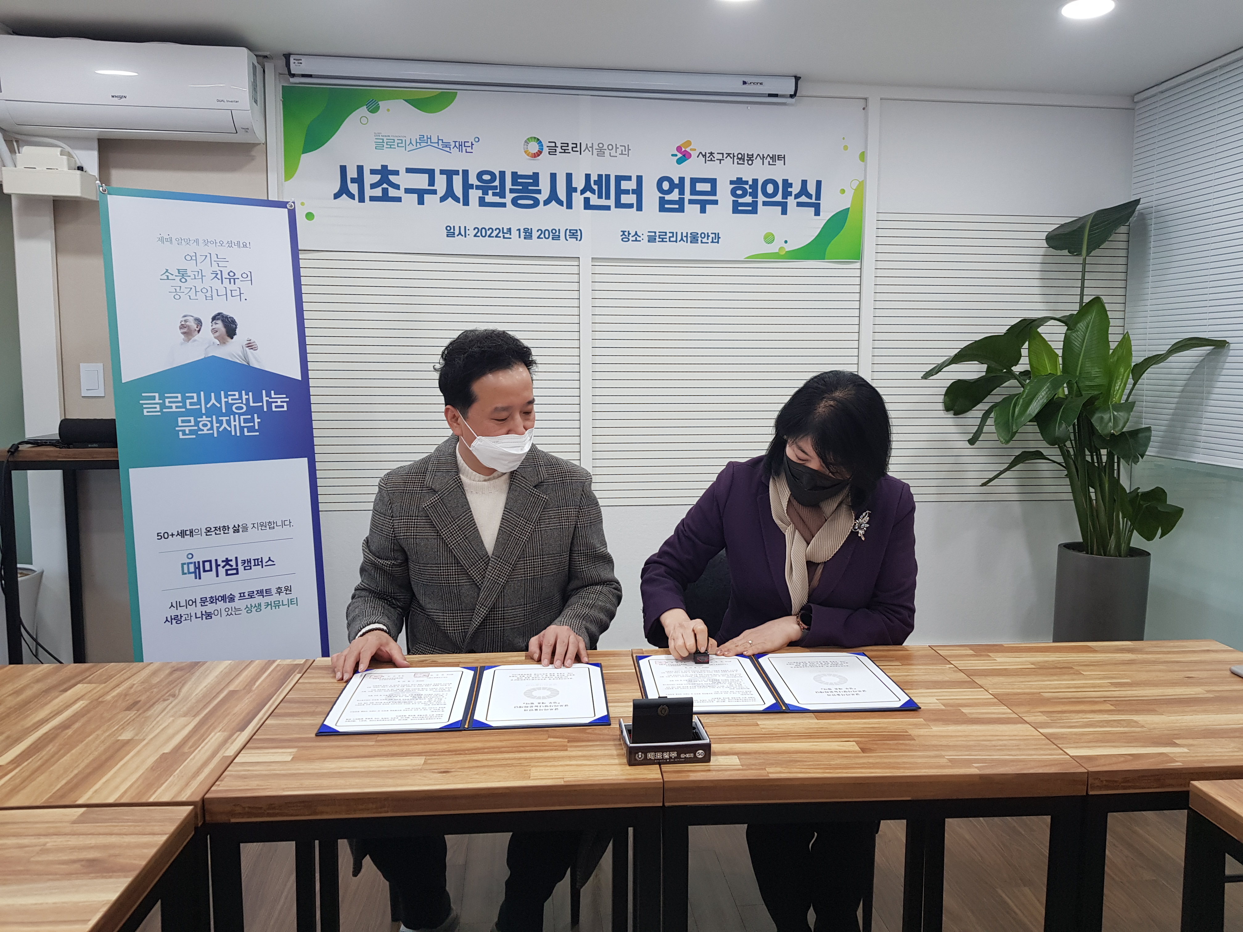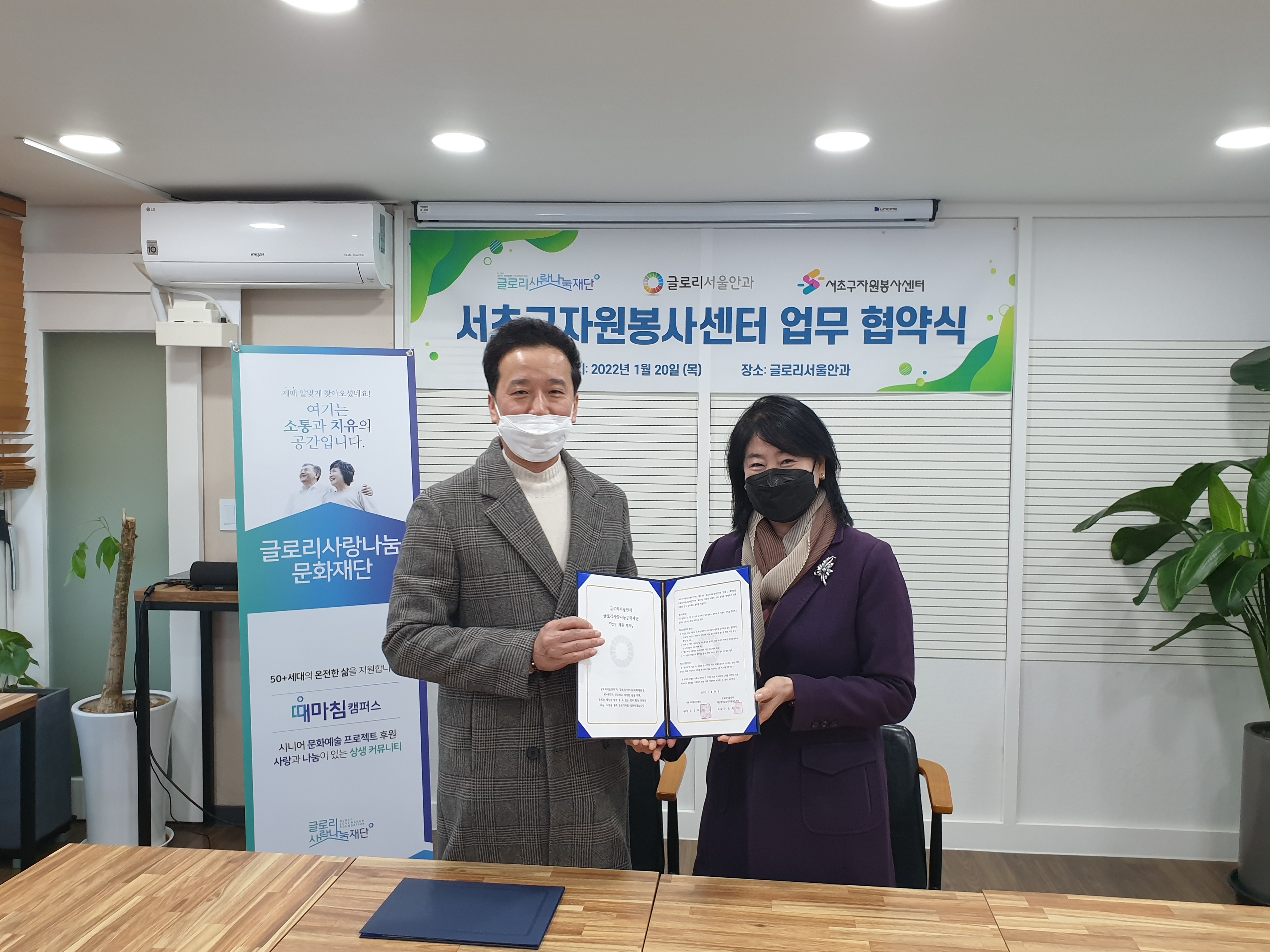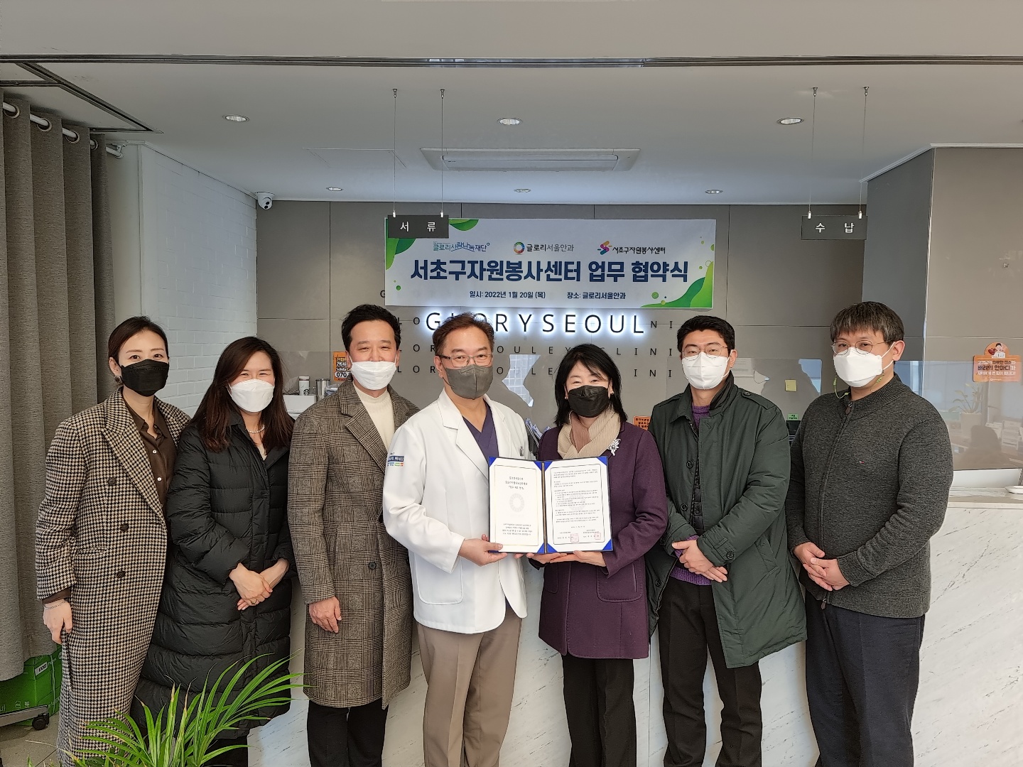 앞으로 서초구자원봉사센터와 글로리사랑나눔문화재단/글로리서울안과는 서초 지역 공공의 사회적 가치 실현을 함께 하기 위해 서로 더 노력하고 함께하도록 하겠습니다. 특히 글로리사랑나눔문화재단에서 진행하고 있는 공모사업에 서초전문봉사단 소속의 아리모(시낭송)/반포자이앙상블(연주)/서리풀마을정원사(조경) 3개 봉사단이 선정되어서 함께 진행하는 중입니다.