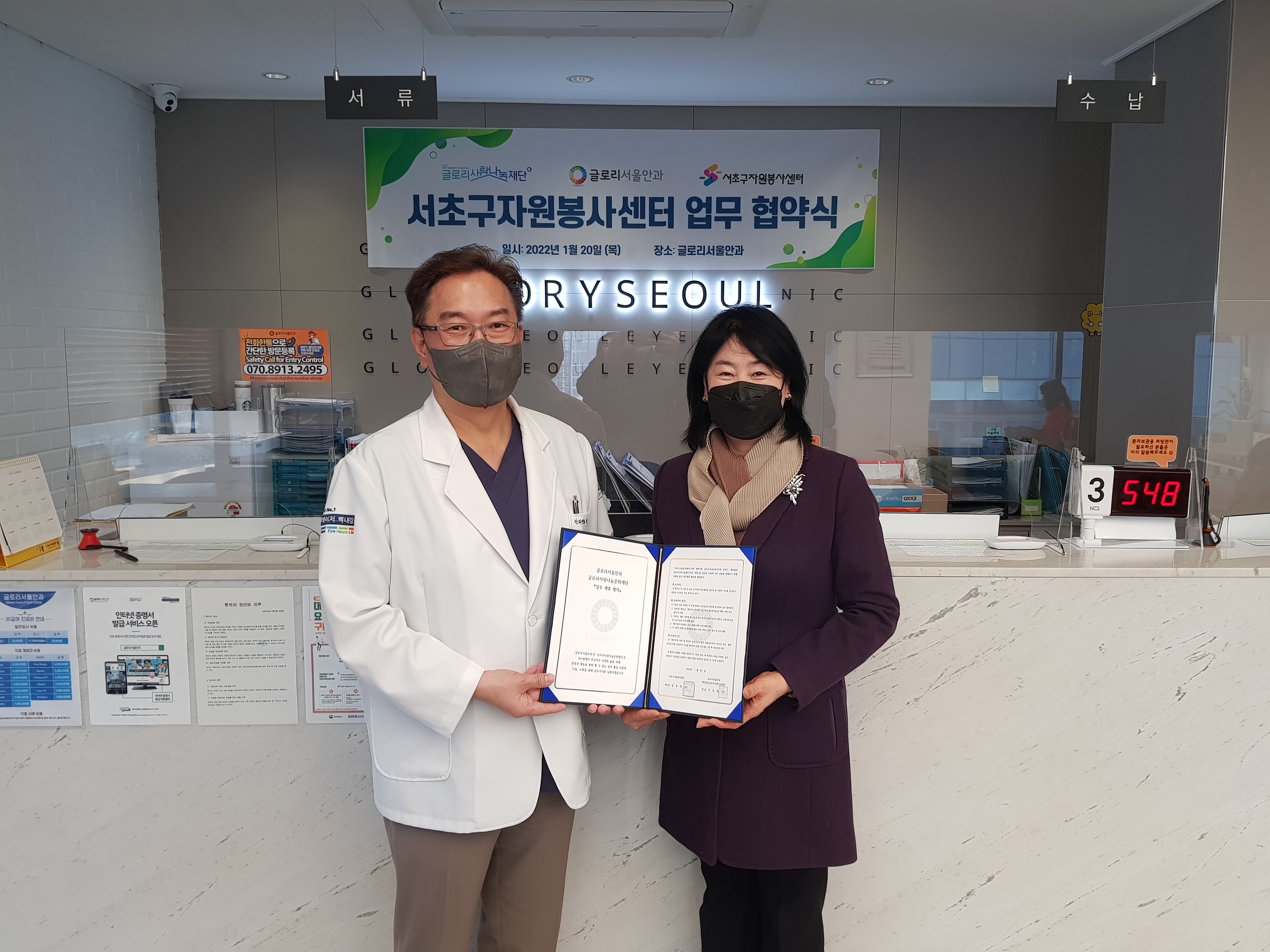 이석종 글로리서울안과 총괄 이사님과 김유미 서초구자원봉사센터 센터장님께서 먼저 협약서 내용을 확인해보고 있습니다.