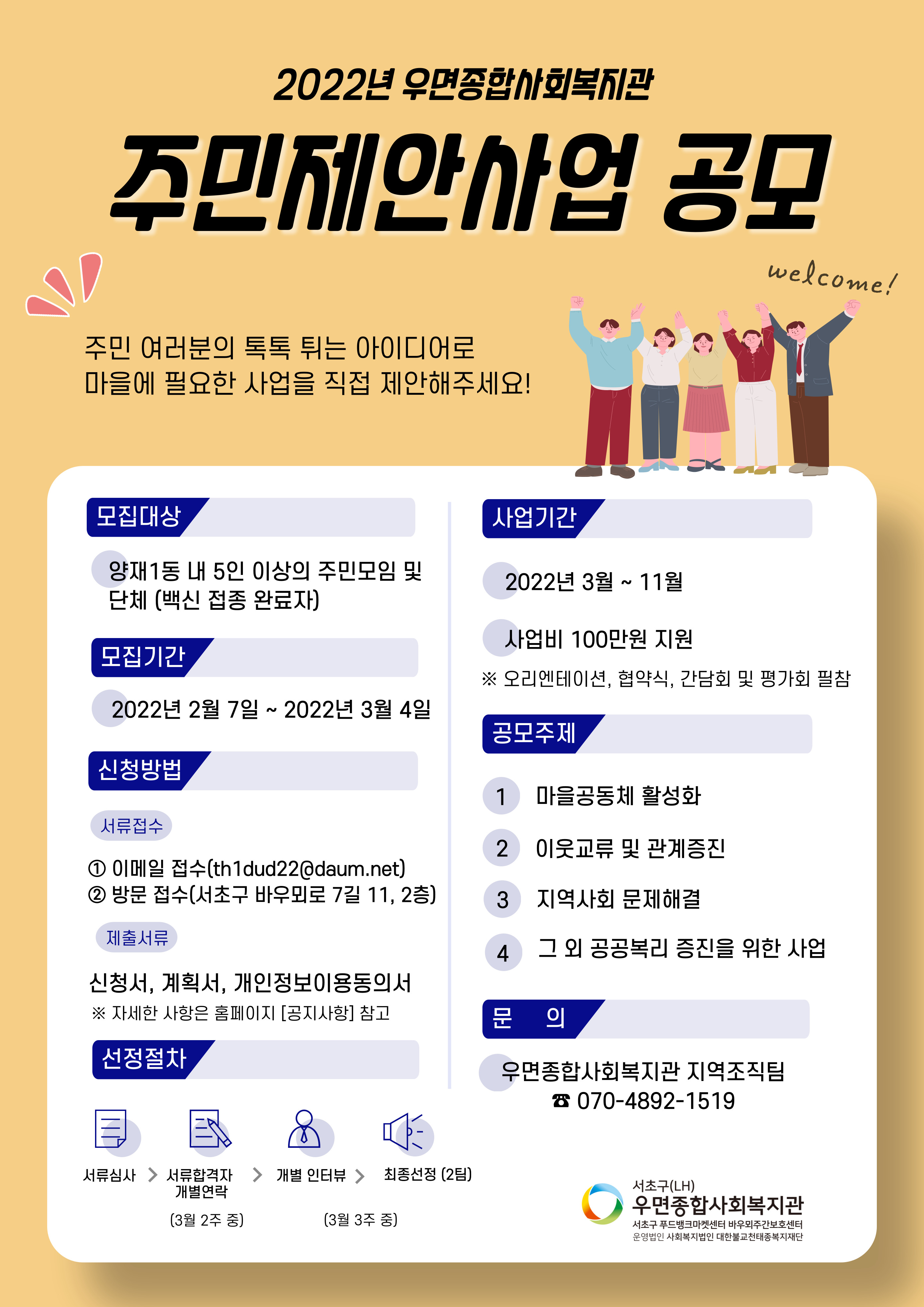 ▣ 문의 : 우면종합사회복지관 지역조직팀 정소영 사회복지사 (☎ 070-4892-1519)