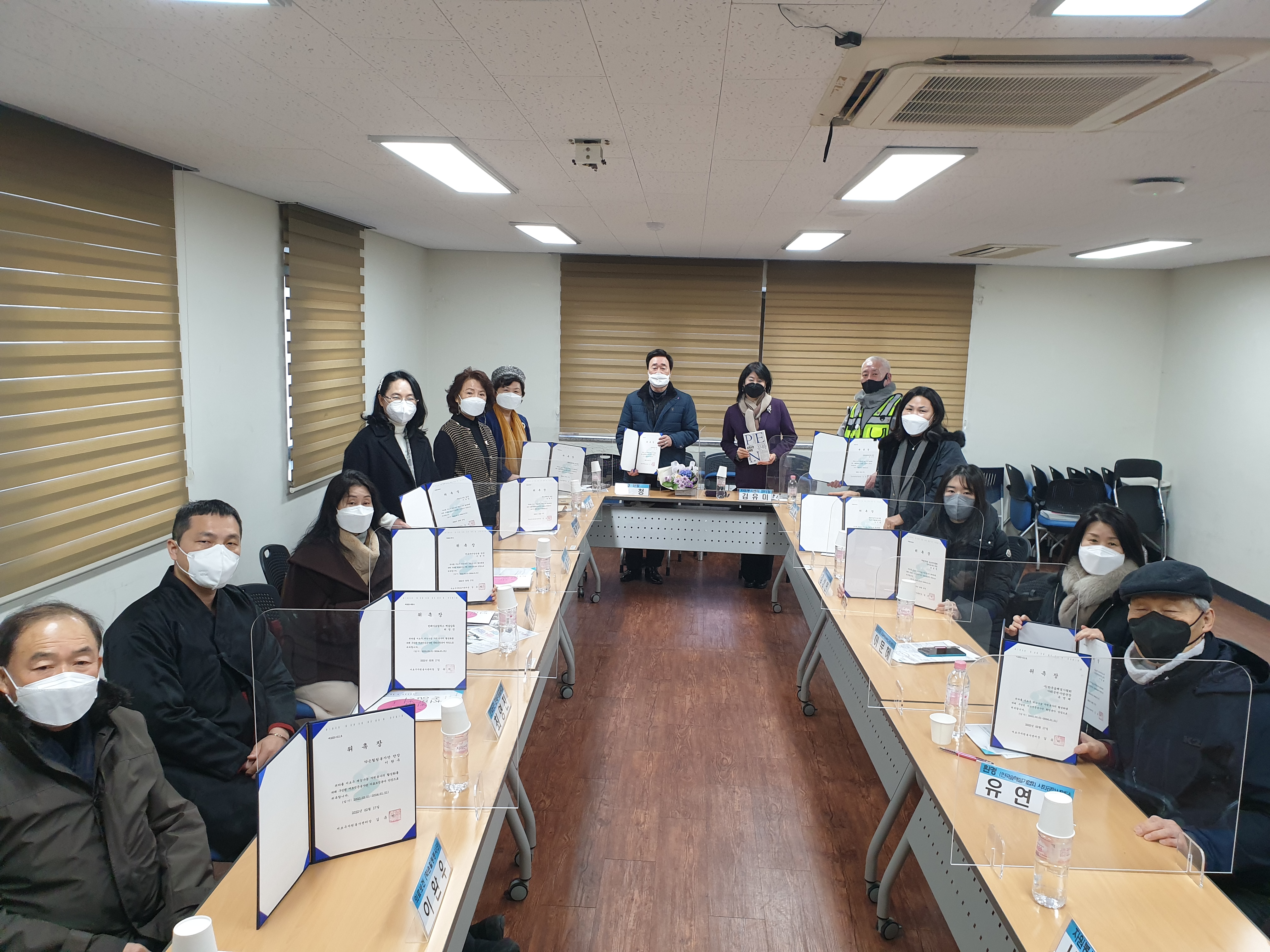 이어 센터의 2022년 주요 방향과 조직 개편을 설명해드린 뒤 2022년 임원진 위촉식을 진행했습니다. 신임 총단장님을 비롯한 총 15명의 단장님이 2년간 서초전문봉사단 임원진으로서 맹활약을 할 예정입니다. ^^