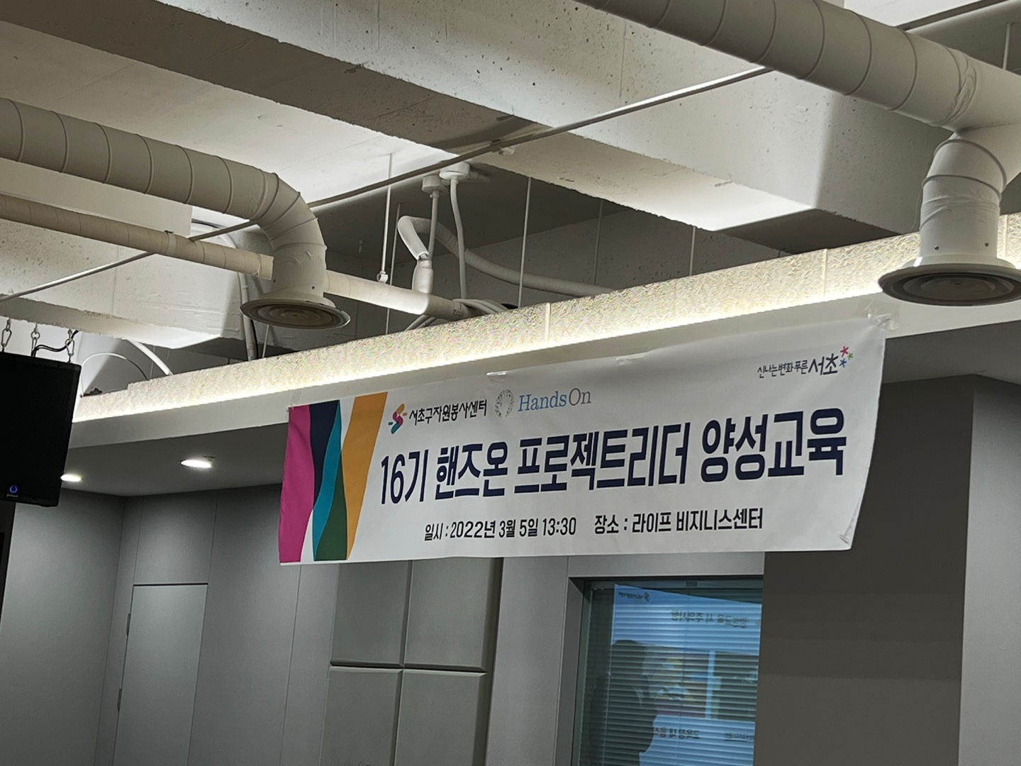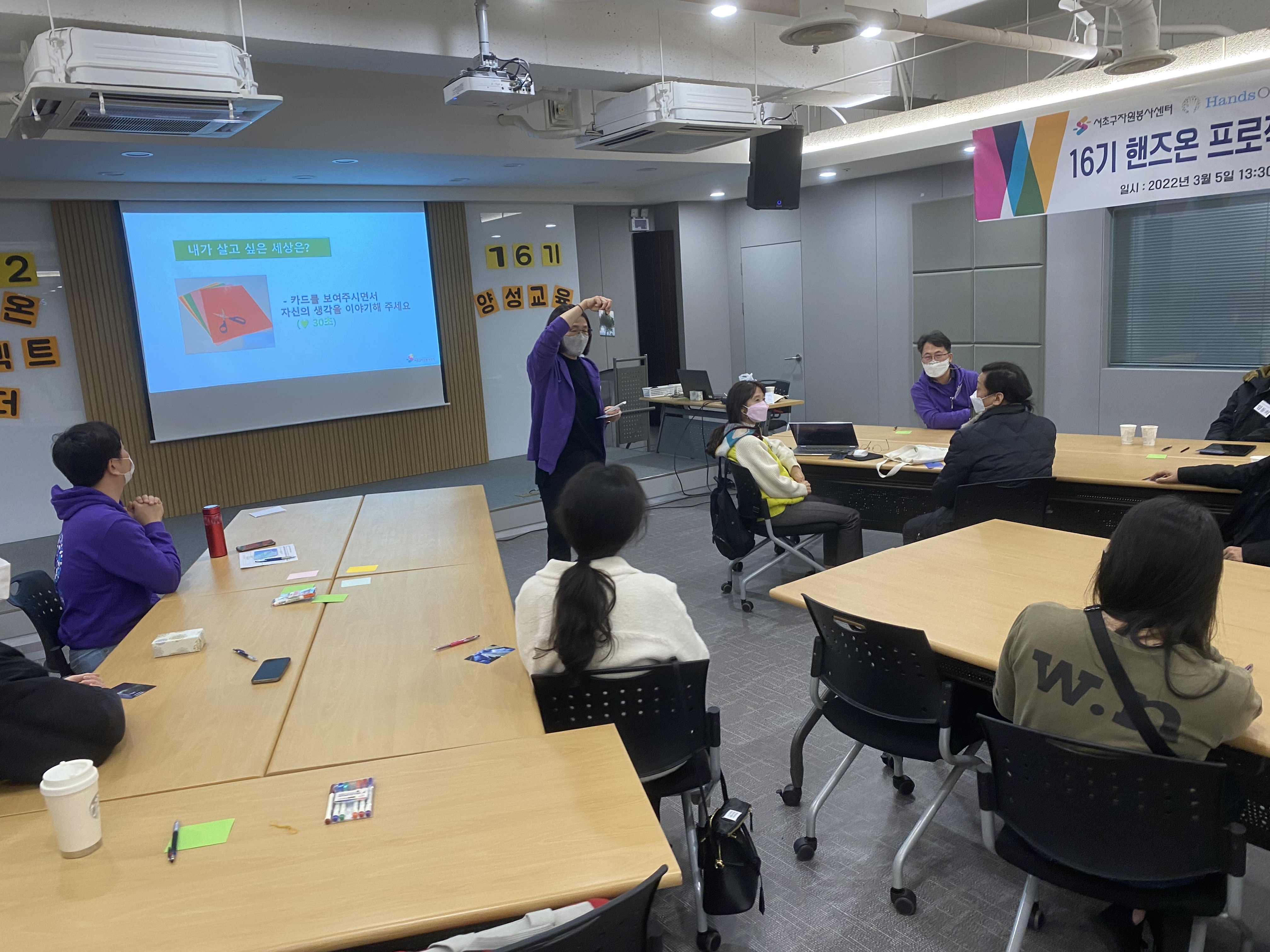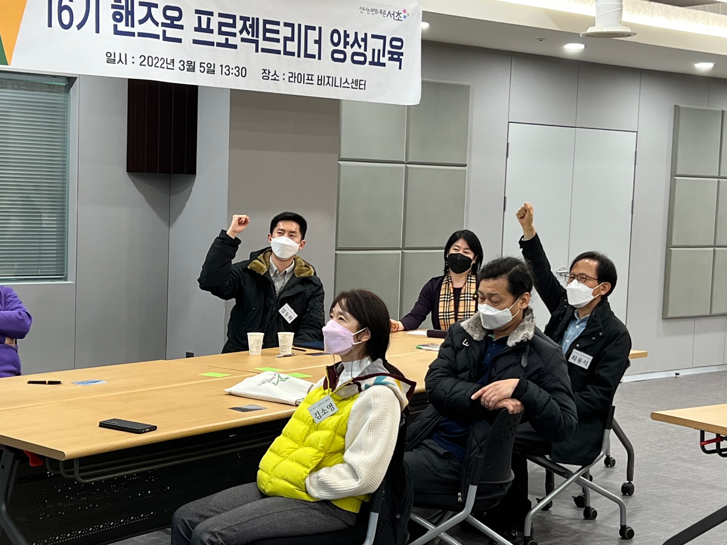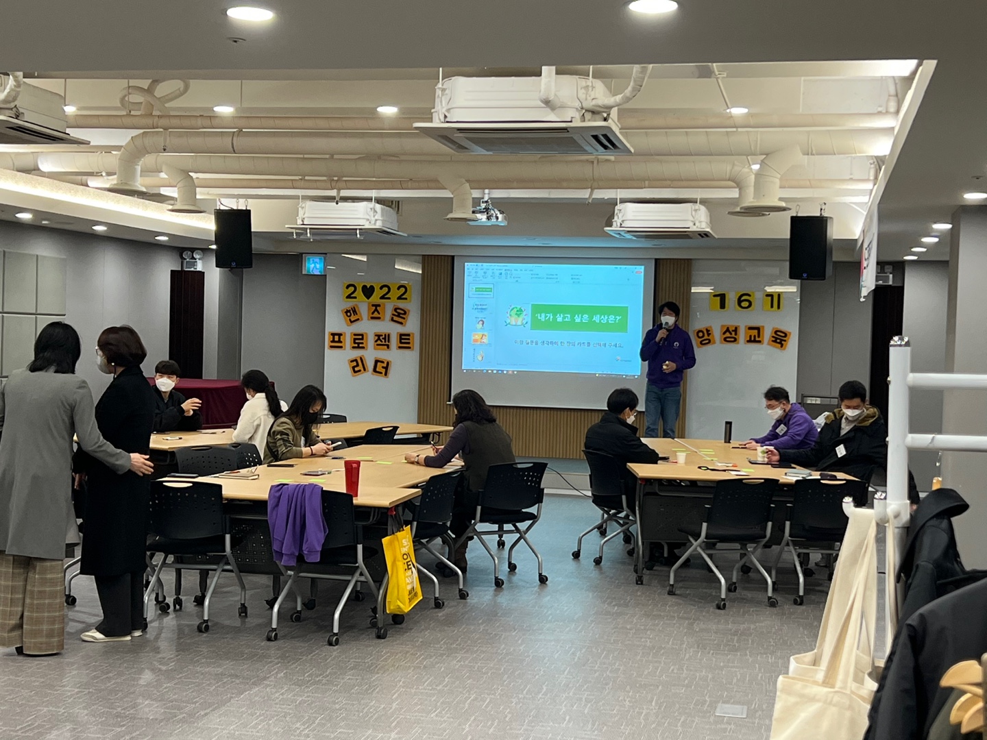 진행을 위해 핸즈온프로젝트 정은희 팀장님 외 4명이 함께해주셨습니다. 이 날 양성교육은 활동하고 계신 프로젝트리더 분들이 하나하나 프로그램을 구성해 자기소개부터 신규 리더분들을 위한 강의를 진행해주셨습니다.