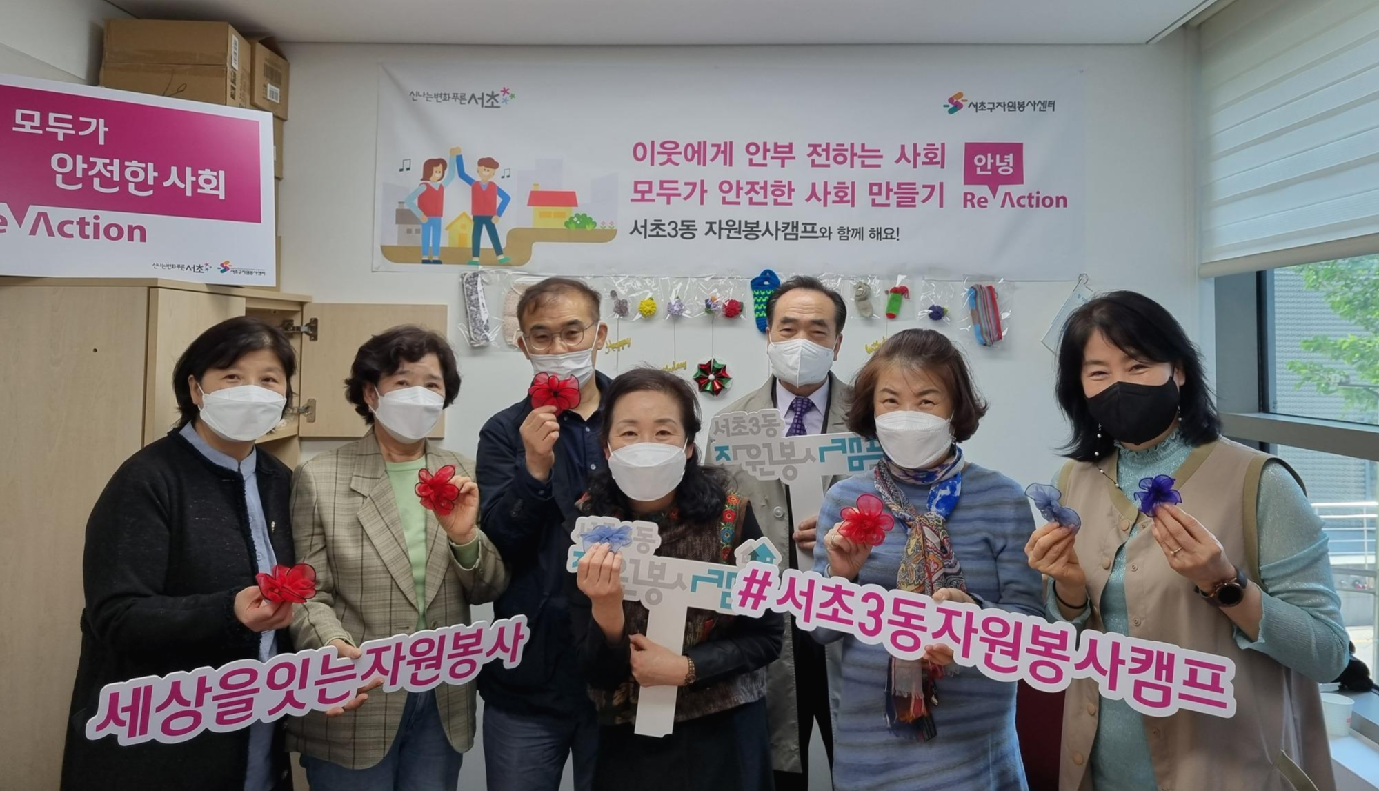 자원봉사캠프는 지역 주민들이 거주지와 가까운 곳에서 쉽게 봉사활동을 할 수 있도록 동 중심으로 활동하는 봉사단인데요. 오늘 만날 서초3동 자원봉사캠프는 지역 내 공동구역을 청소하는 클린싹싹활동뿐 아니라 홀몸어르신들 대상 물김치 나눔활동 등 평소에도 지역을 위해 활발하게 활동하고 있는 캠프입니다!