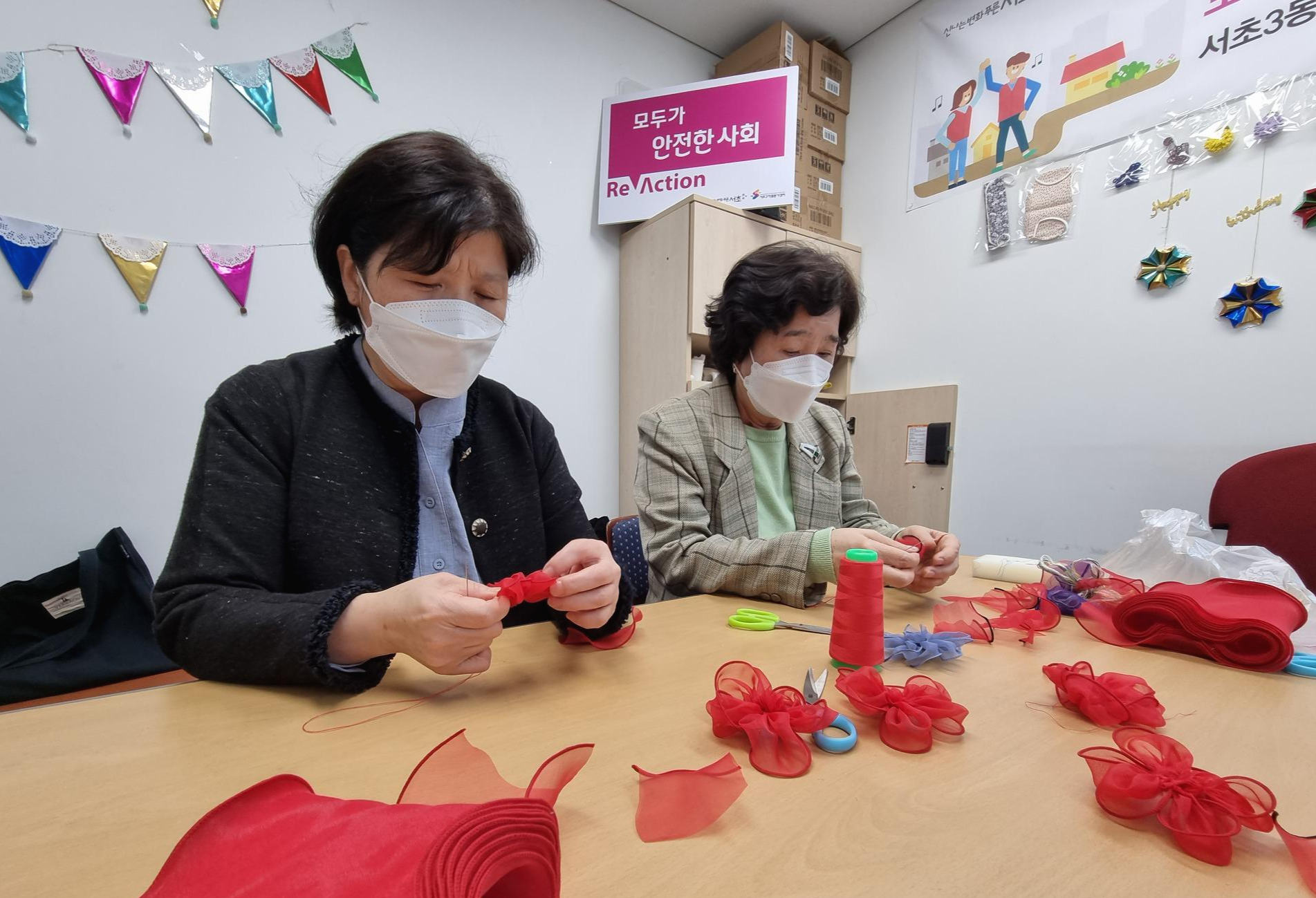 오늘은 서초3동 캠프에서 동네 어르신 분들께 전달할 카네이션 코사지를 만드는 날인데요,