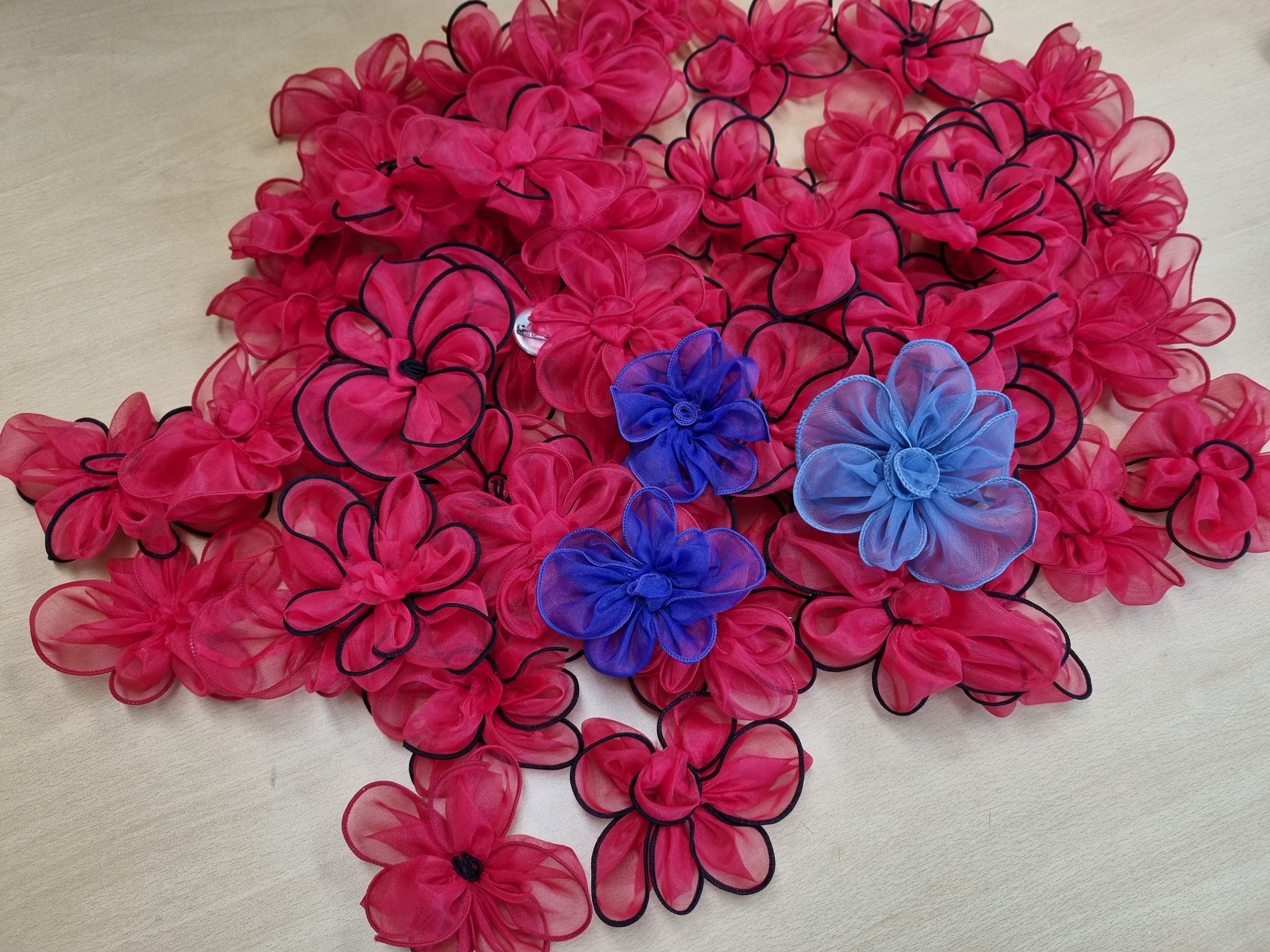 사진을 보시면 여러 색의 꽃들이 모여 있습니다. 1차적으로 전달될 카네이션 코사지는 빨간색으로, 그리고 나중에 판매가 될 꽃들은 푸른색 그리고 보라색으로도 제작이 되었어요. 판매 수익은 불우이웃돕기에 이용될 예정이라고 합니다!