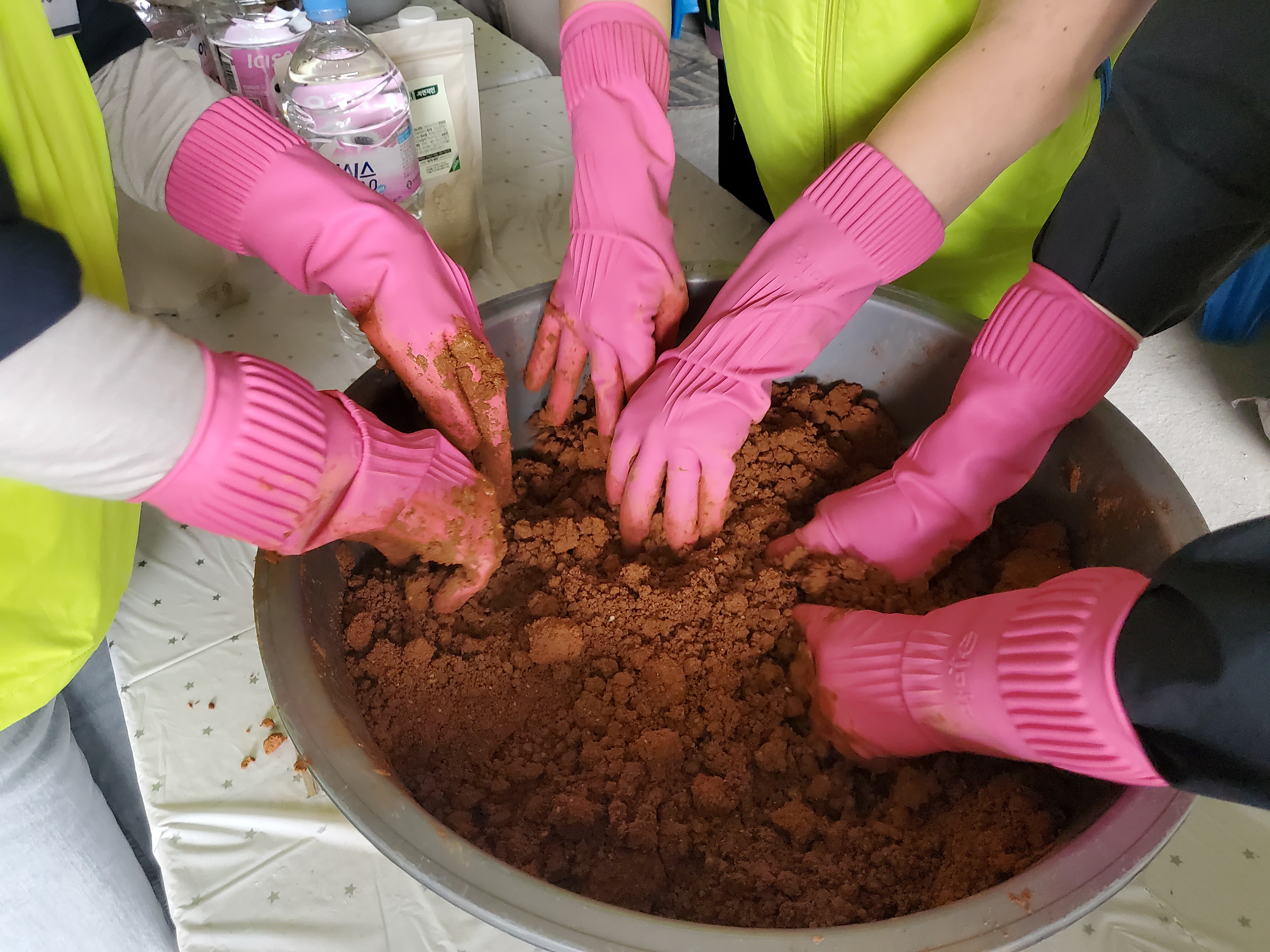 EM활성액, 황토, 발효촉진제 등 재료들을 섞은 후 공모양으로 만들었는데요.