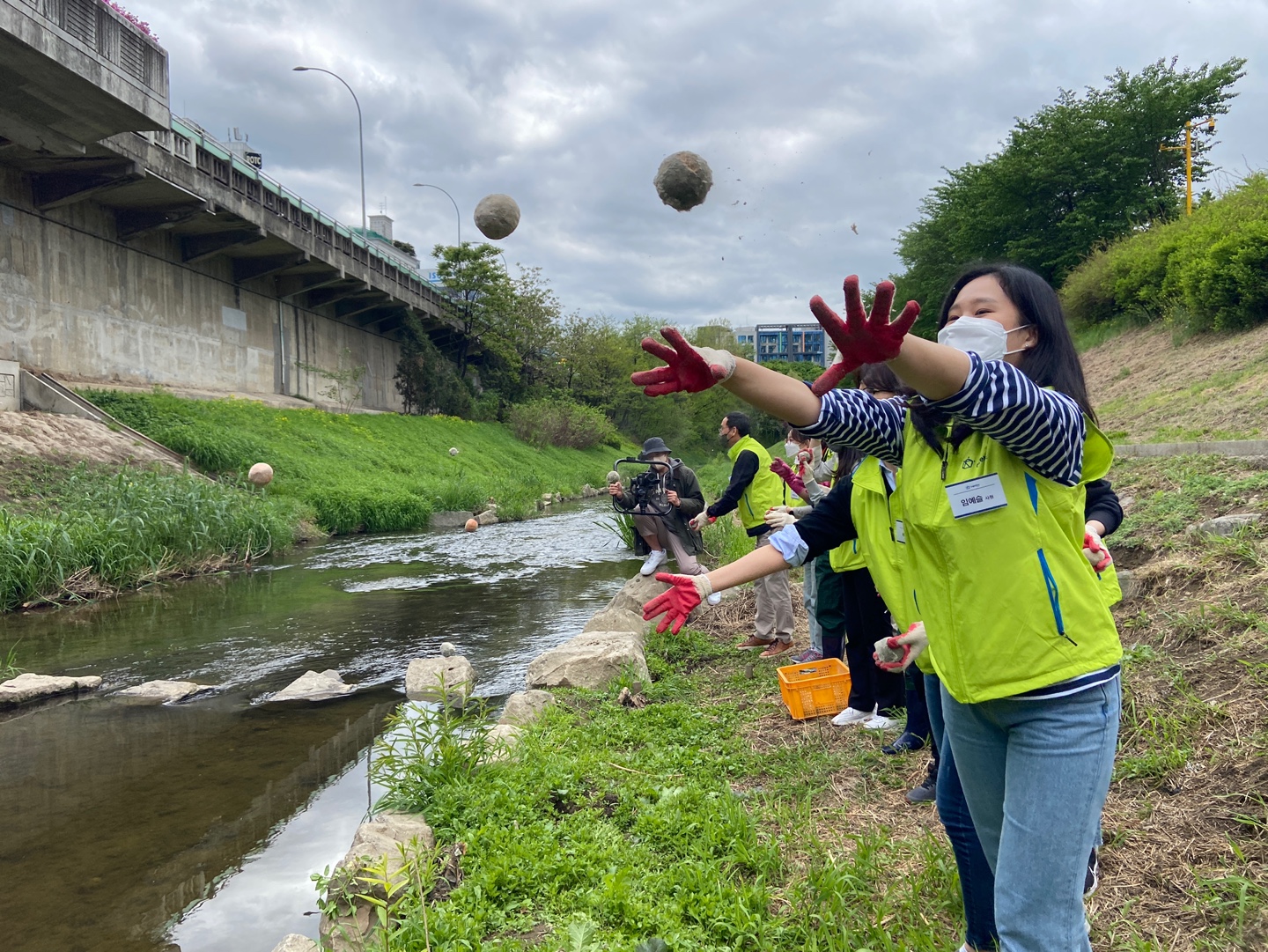 EM흙공은 하천을 정화시켜주는 공으로 하나를 던지면 한 달 동안 1제곱미터의 양을 정화시킨다고 합니다.