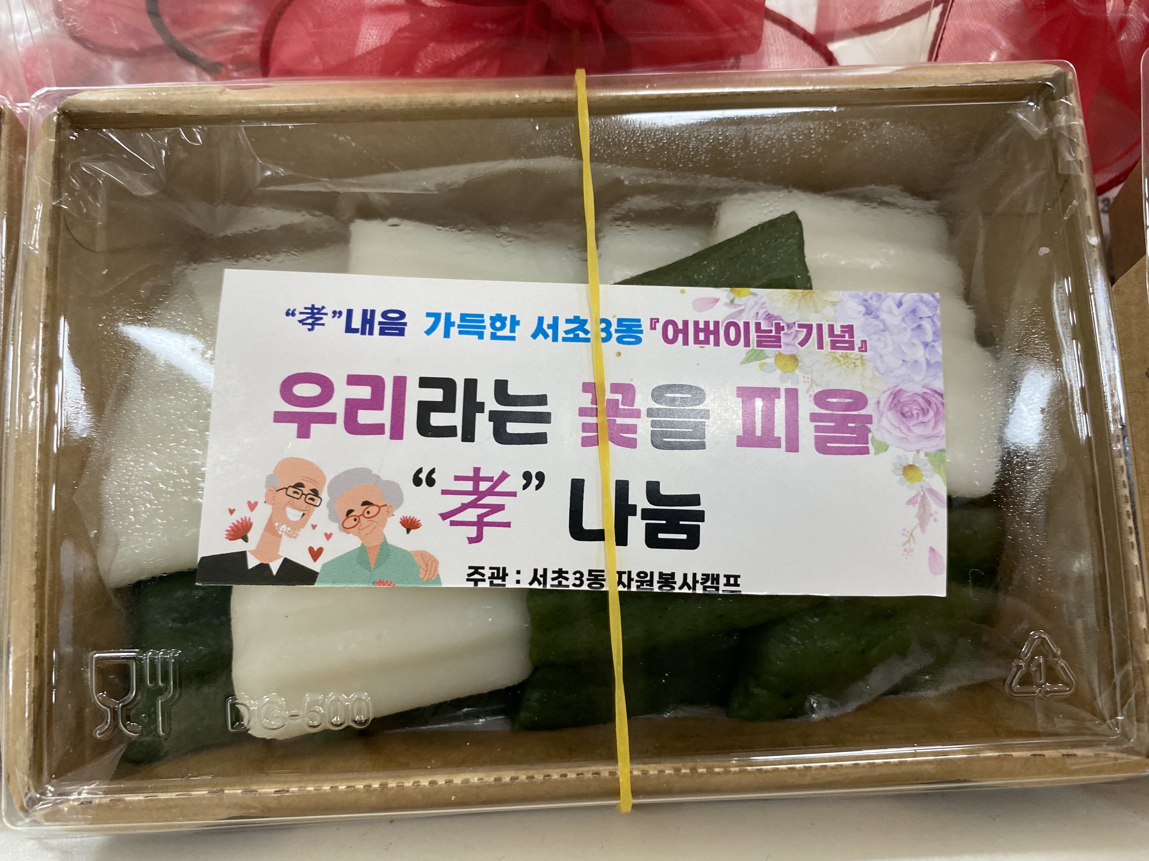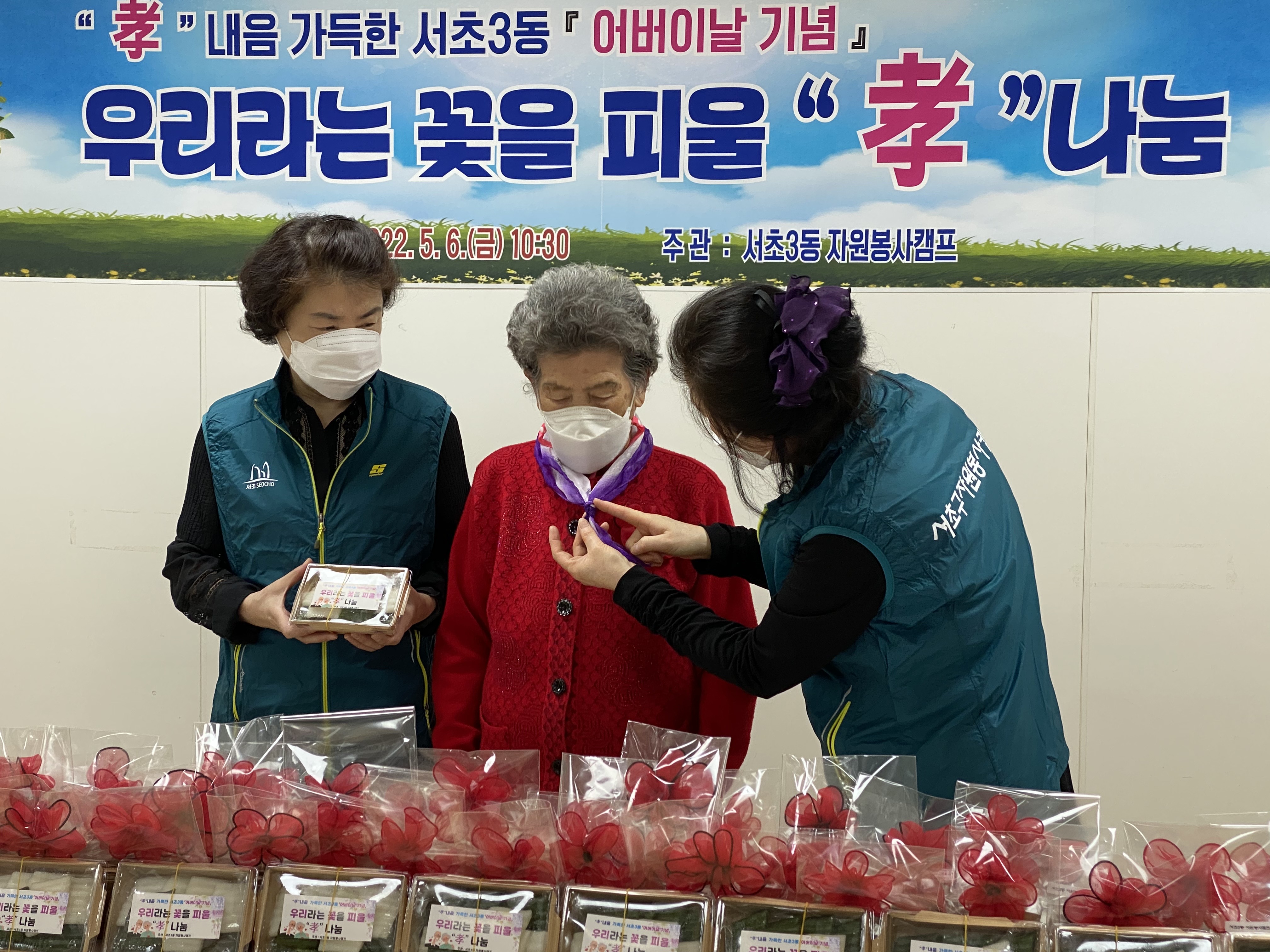 카네이션 코사지와 떡은 당일 서초3동 지역 어르신들 60분께 전달드렸습니다.
