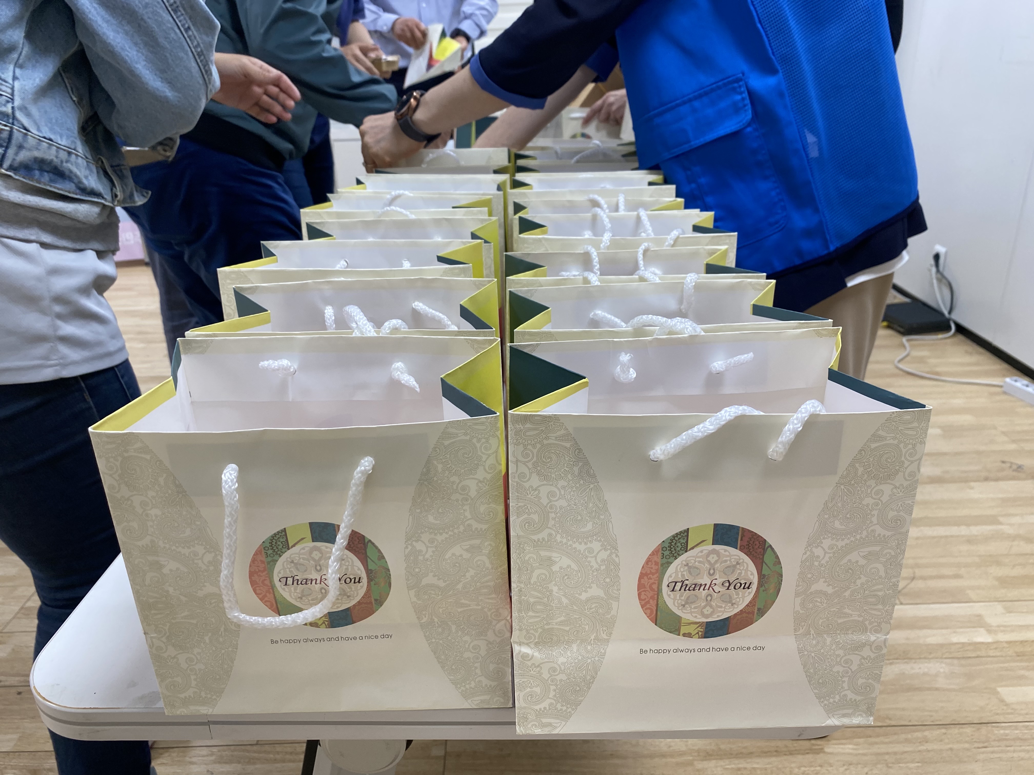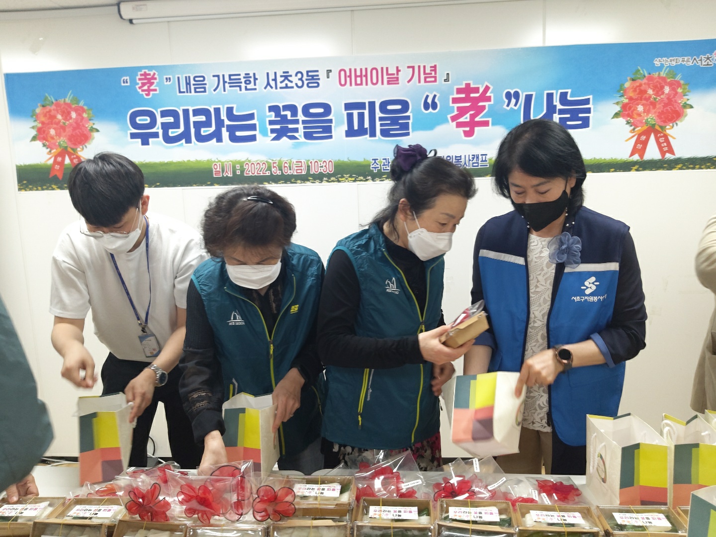 서초3동 자원봉사캠프 활동가들이 고이 만든 카네이션 코사지와 떡을 포장하고 있네요.