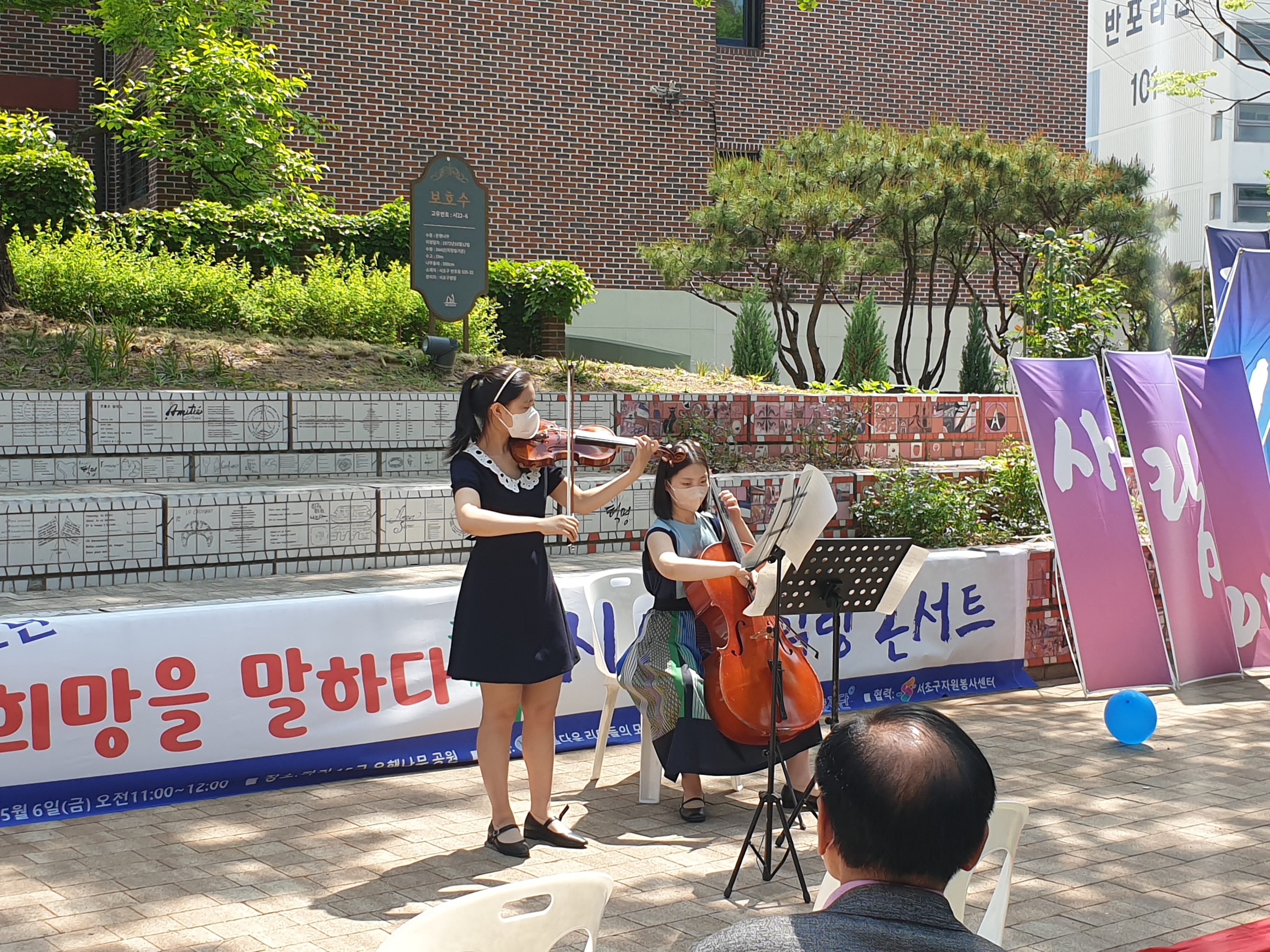 먼저 서유진, 서유니 자매의 사랑의 인사 (Salut d' Amour) 합주로 콘서트의 시작을 알렸습니다. 두 자매 모두 국내 유수의 음악콩쿠르에서 수상한 미래의 음악 꿈나무들인데요. 멋진 연주를 통해 공연을 보러오신 구민들의 마음을 사르르 녹아들게 했습니다.