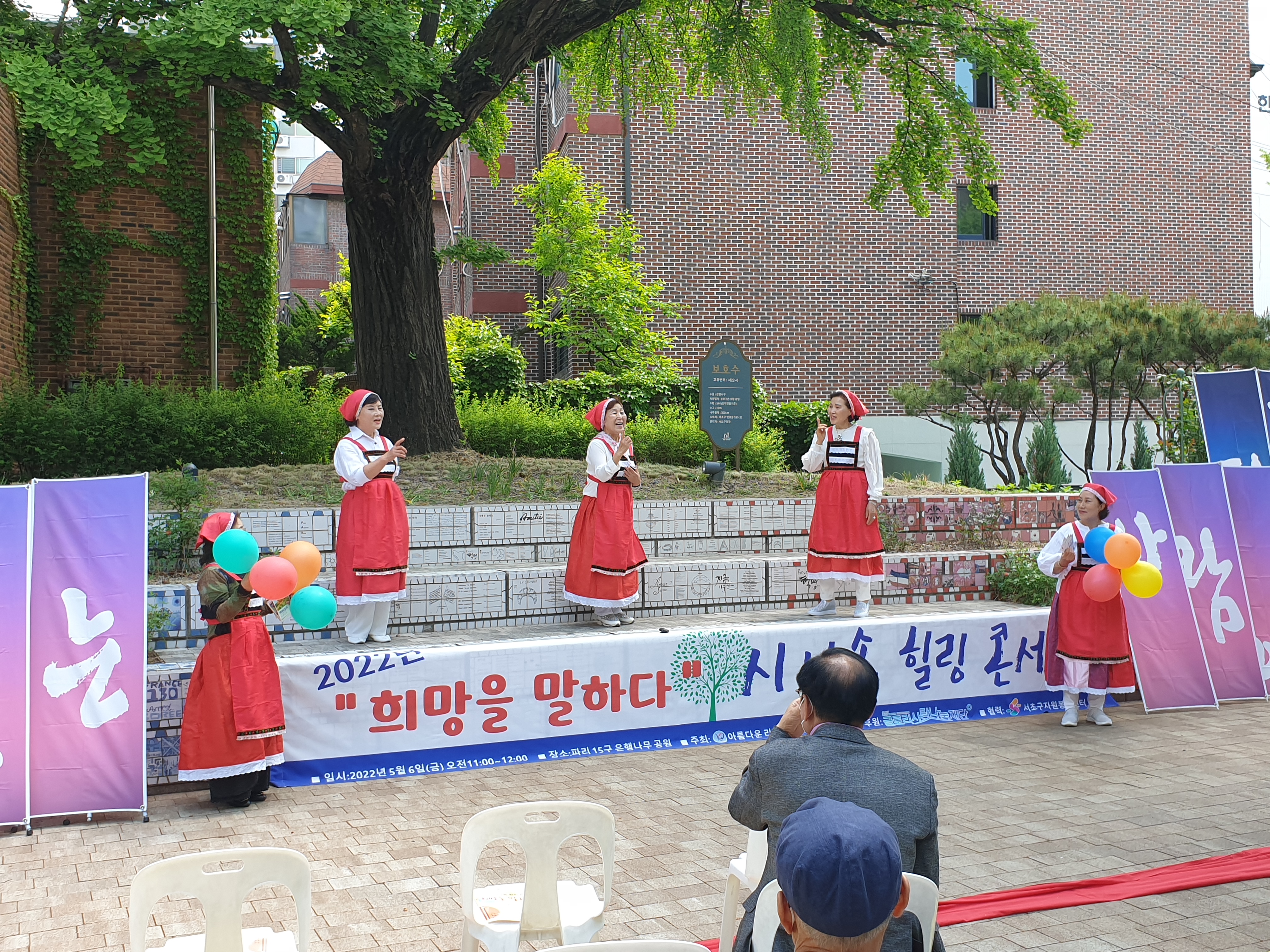 이어서 시낭송 퍼포먼스가 진행되었습니다. 김애순, 박용란, 유선형 선생님이 꽃씨 한 개(시 김구연)와 꽃(시 김춘수) 시낭송과 더불어서 희망과 꿈을 담은 퍼포먼스(김용덕, 김연옥)를 진행했습니다. 퍼포먼스로 왈츠를 추면서 중간중간에 꽃씨와 풍선을 나누어주는 것이 인상적이었습니다.