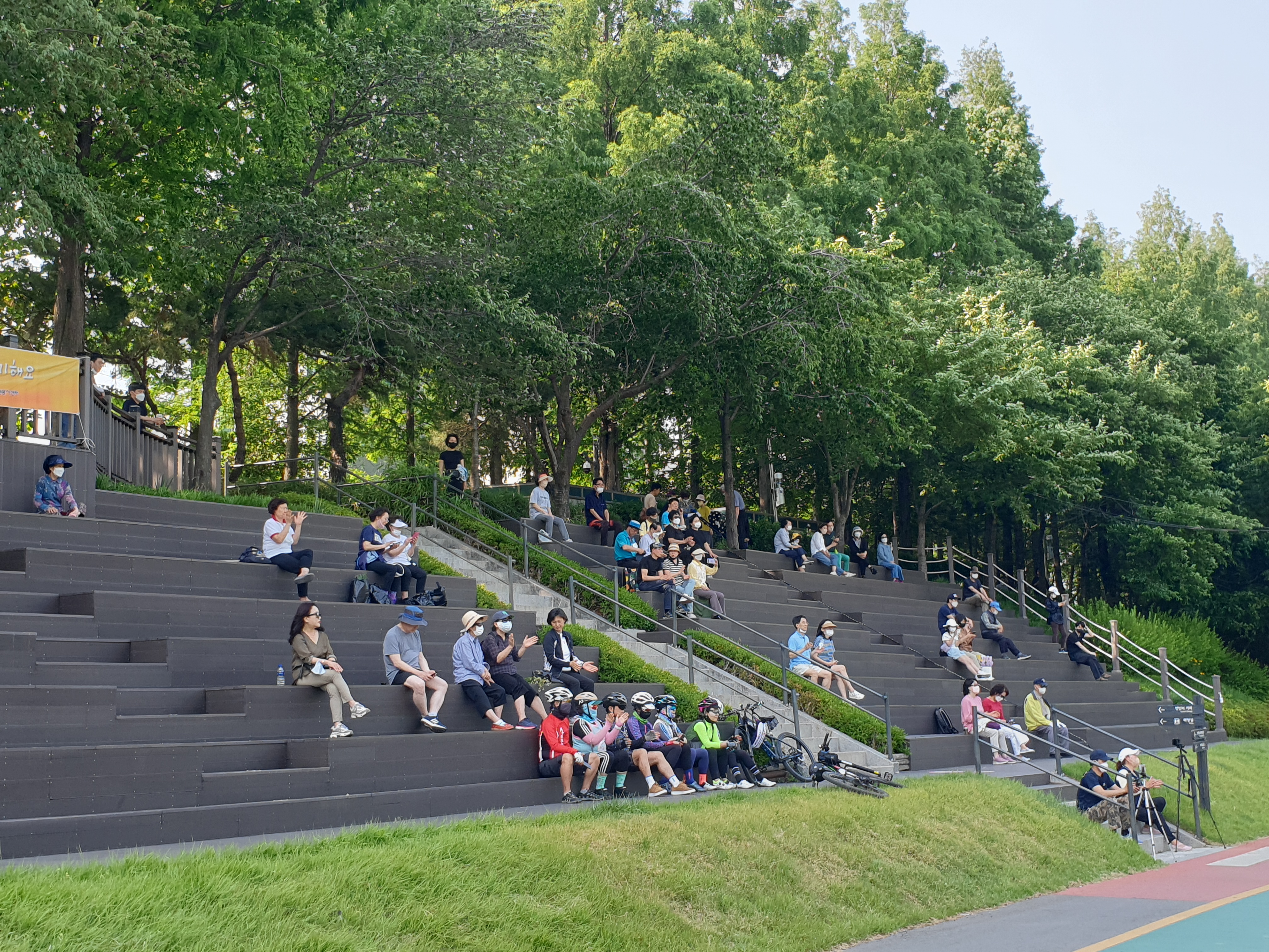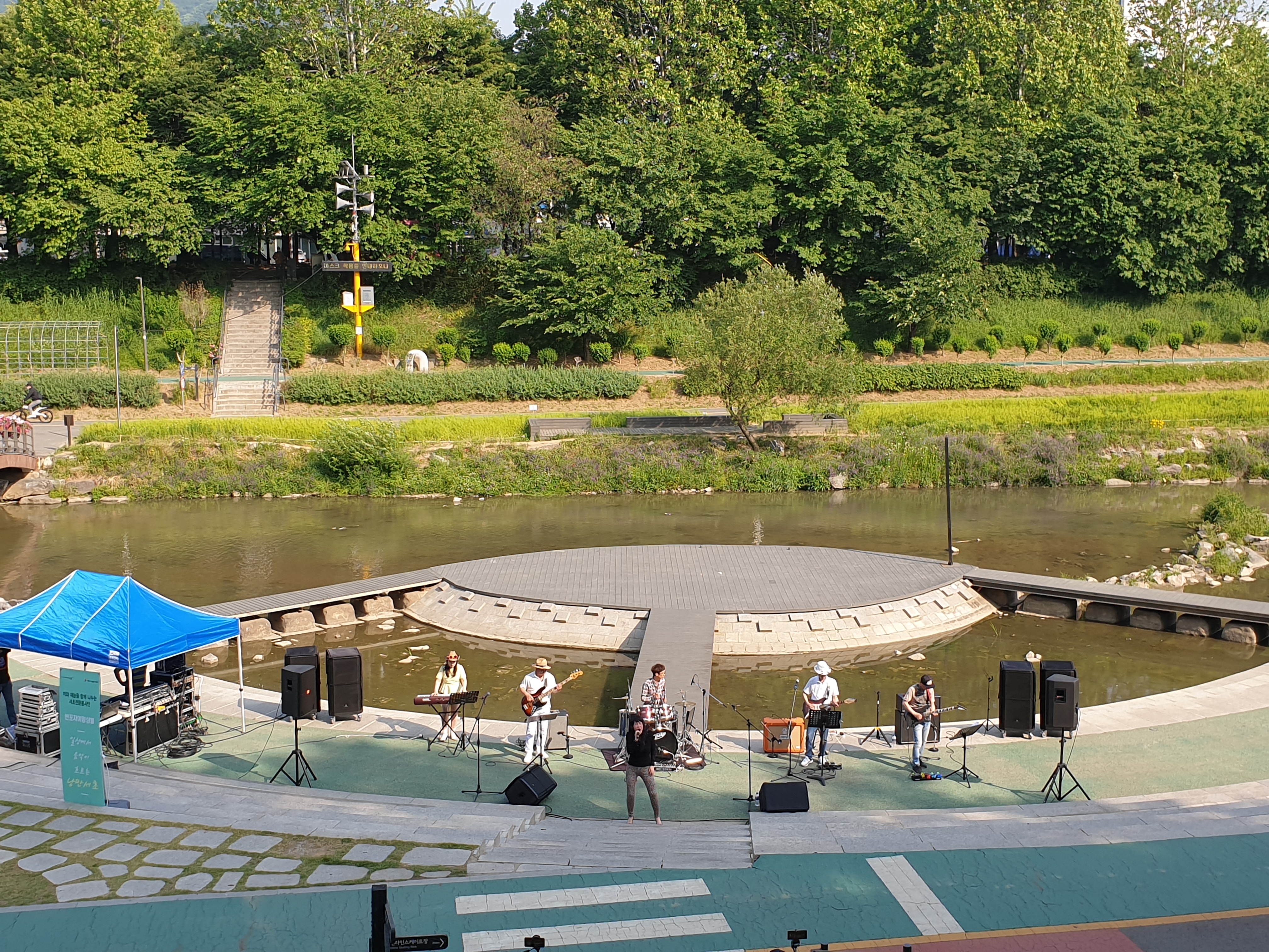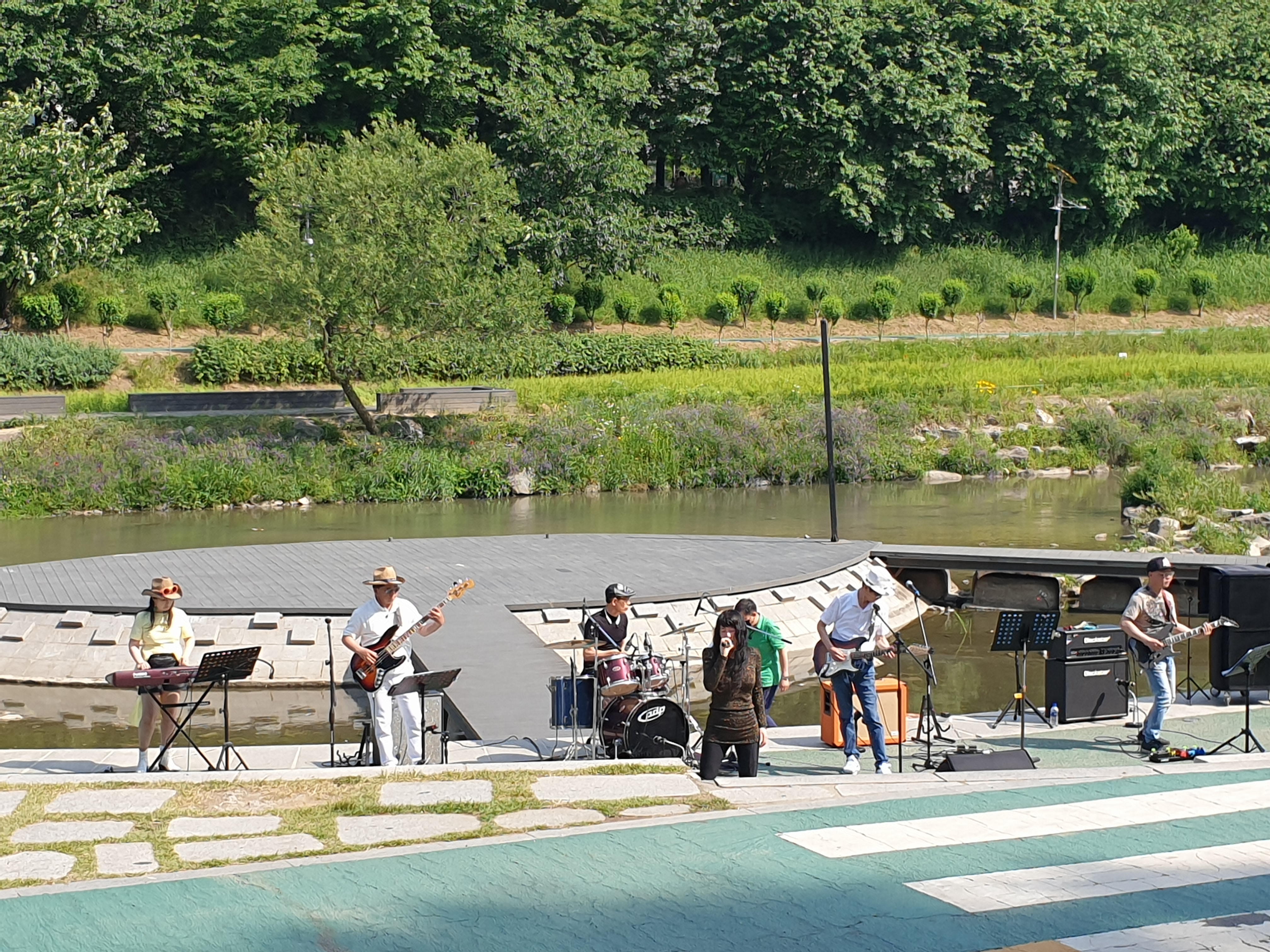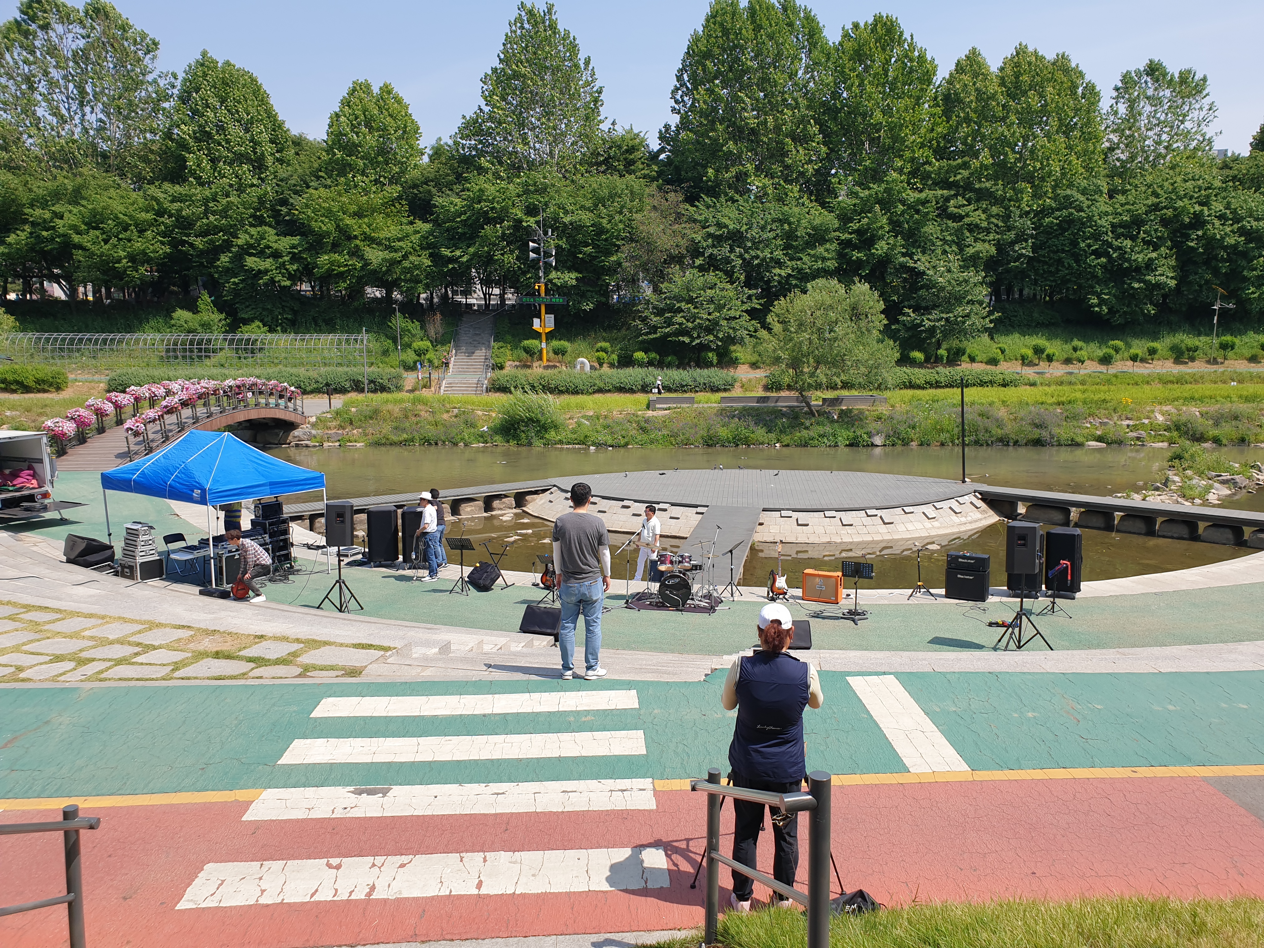 공연에 앞서서 음향 및 장비를 세팅하고 있습니다. 여러 구민들이 이용하는 양재천이다 보니 안전을 최우선시 하면서 세팅을 진행했습니다.