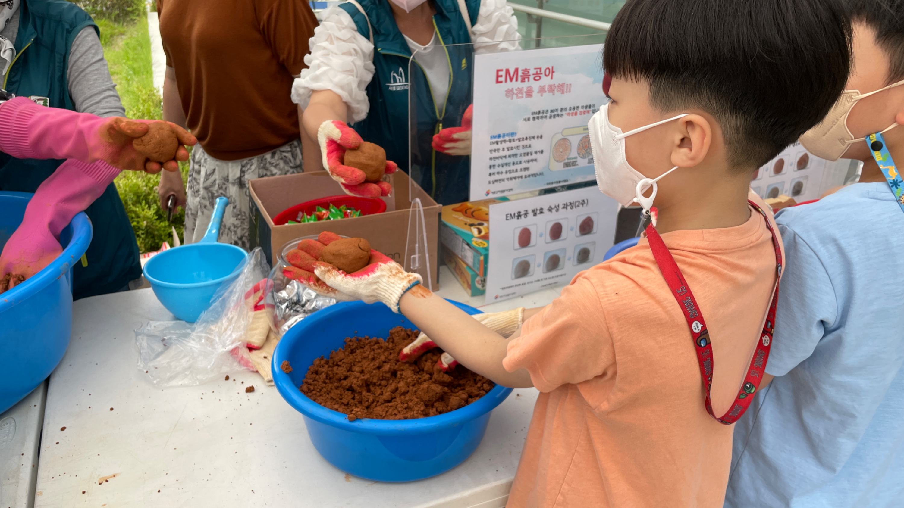 이번활동은 좀 더 특별하였는데요, 내곡초등키움센터와 연계하여 초등학교 학생들과 같이 EM흙공을 만들고 만들어진 흙공을 던지는 활동까지 진행하였습니다.