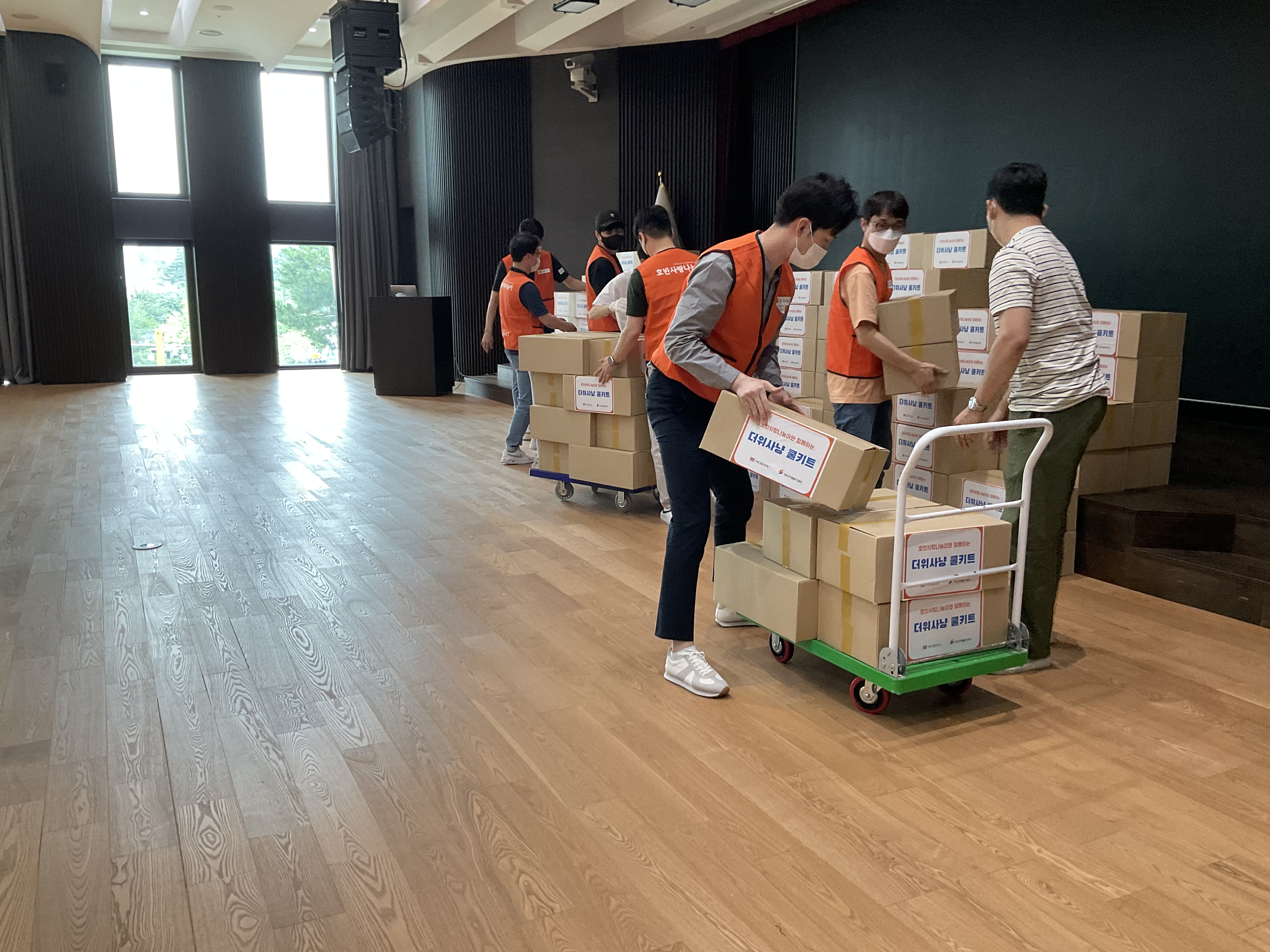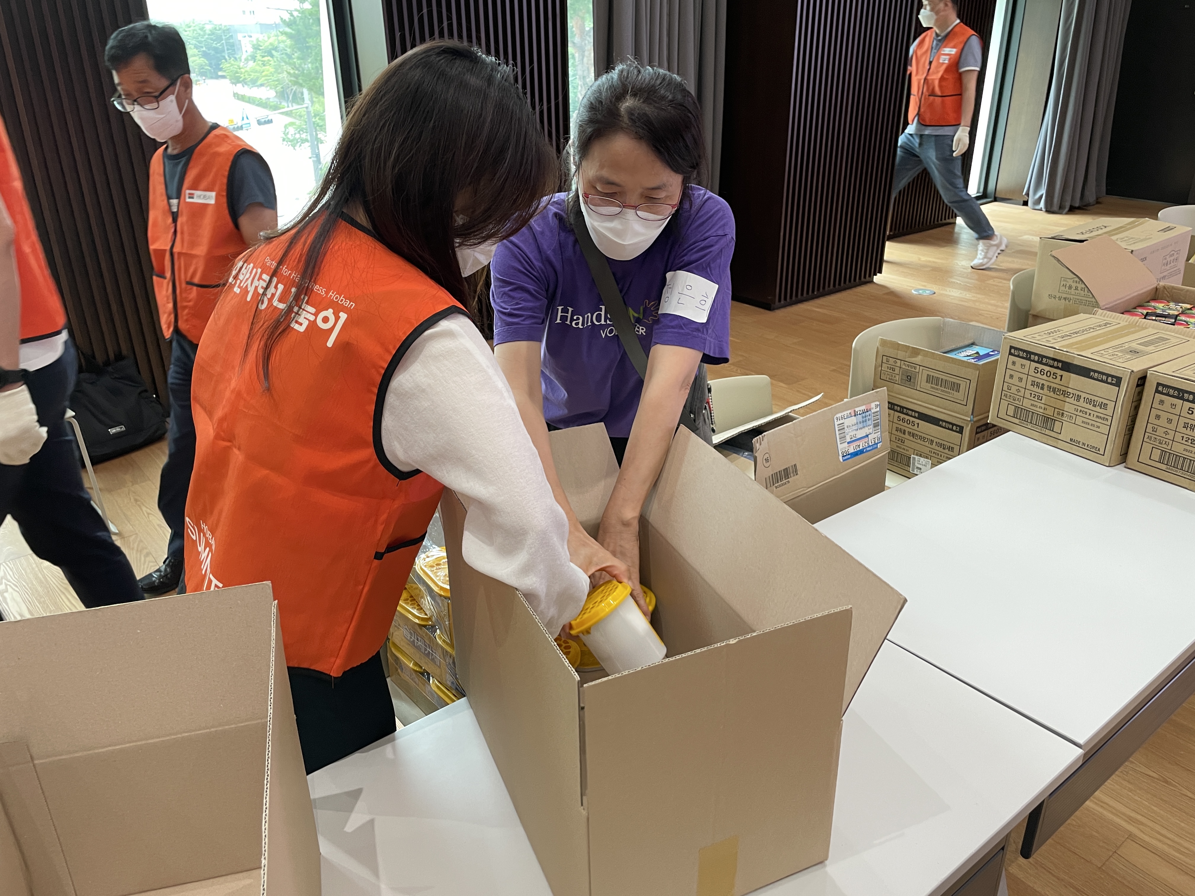 이번 활동은, 서초구자원봉사센터 프로젝트리더와 호반건설 임직원들이 함께 기후약자들을 위한 쿨키트 제작에 나섰는데요. 2019년 건강부채 만들기 활동 이후 코로나 팬데믹 사태로 다시 모이지 못하다가 오늘은 아주 오랜만에 재개된 활동입니다.