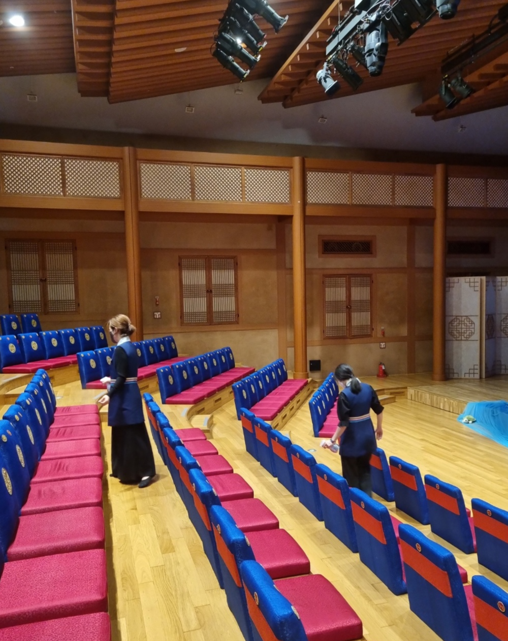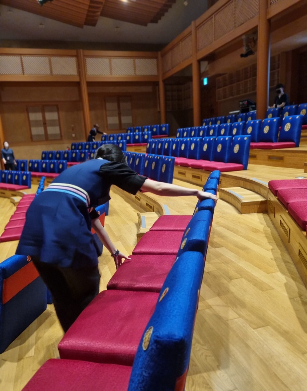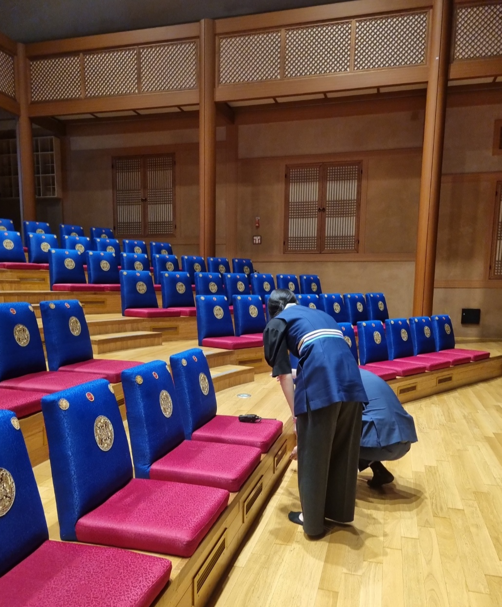 먼저 좌석 정렬을 하시면서 신발을 벗고 입장하는 공연장 특성상 날카로운 부분이 없는 지 확인하는 것도 안내봉사단께서 하고 계십니다. 특히 잘 안 보이는 모서리나 계단 아래 부분을 주의 깊게 살피신다고 합니다.