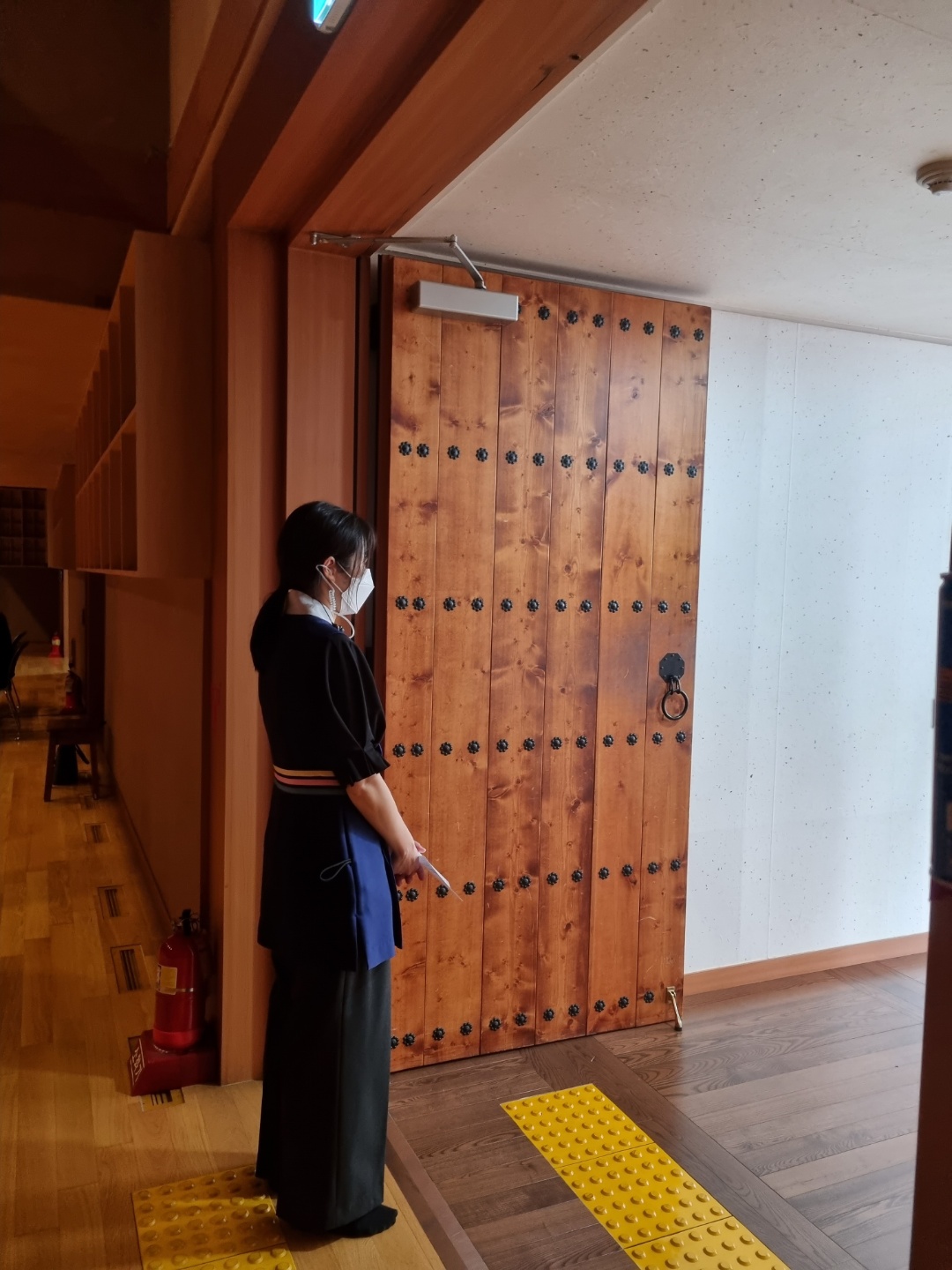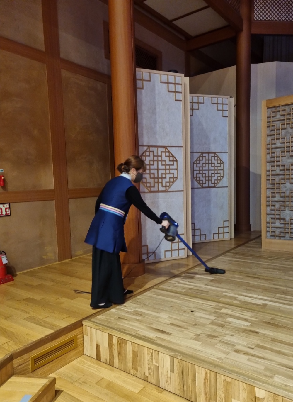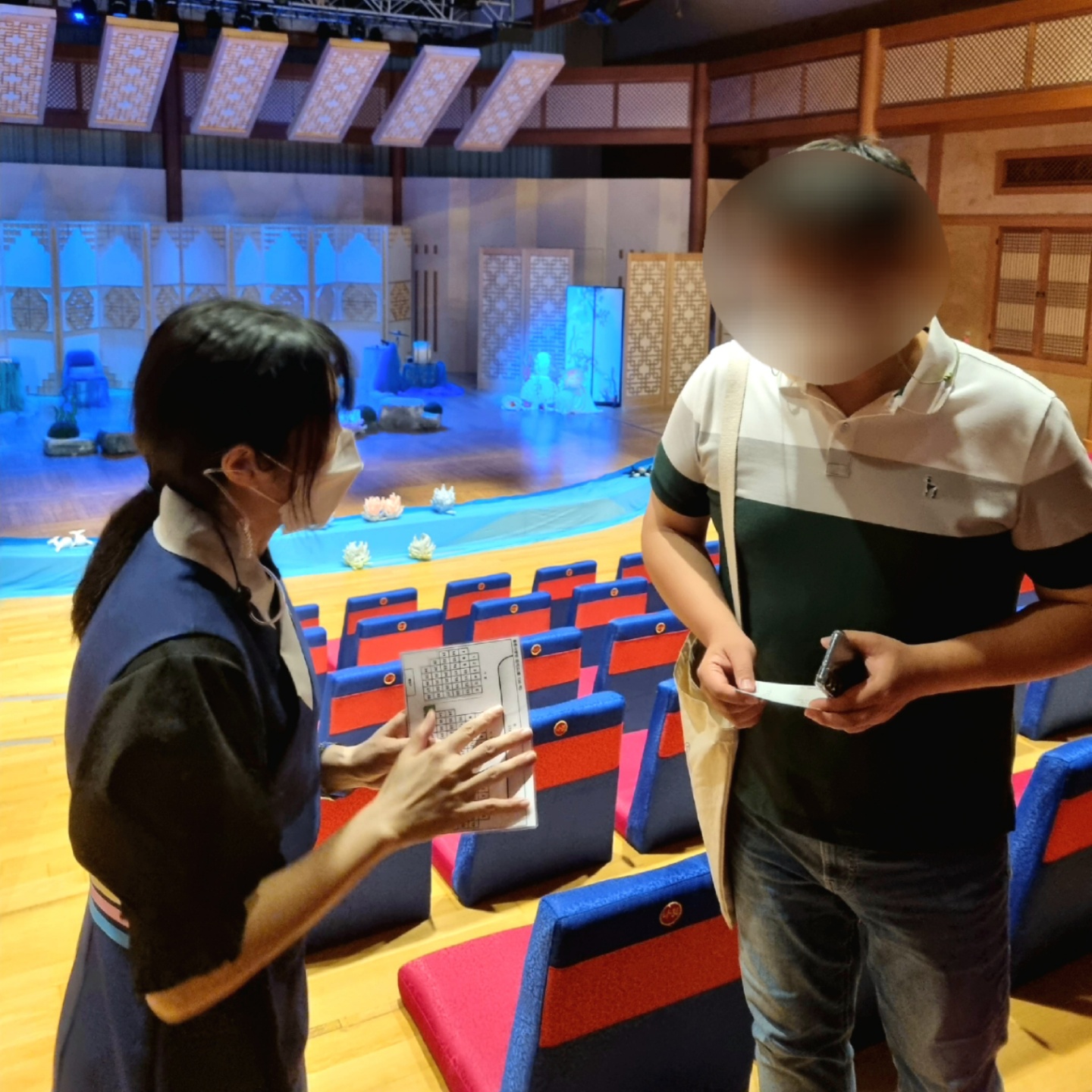 먼저 좌석 정렬을 하시면서 신발을 벗고 입장하는 공연장 특성상 날카로운 부분이 없는 지 확인하는 것도 안내봉사단께서 하고 계십니다. 특히 잘 안 보이는 모서리나 계단 아래 부분을 주의 깊게 살피신다고 합니다.