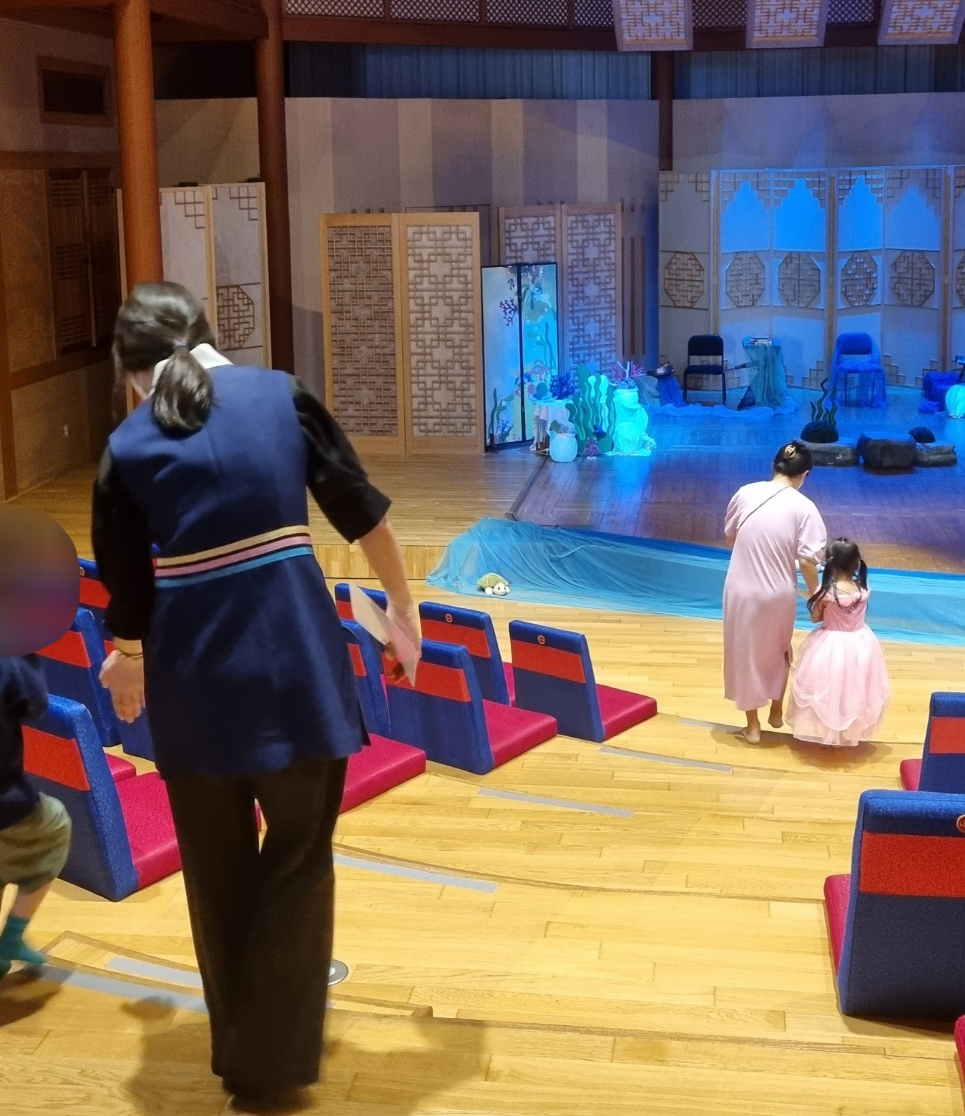 류현주 봉사자님 : 그리고 일반공연의 경우, 지연 관객 입장이 어려운 경우가 많잖아요? 그런데 토요국악동화는 어린이용 공연이기 때문에 공연 시작 후에도 공연장 출입이 가능합니다. 다만 공연 중에는 공연장이 어둡기 때문에 저희가 좌석 찾기를 도와드리고 있습니다. 또한 코로나 이전에는 공연 종료 후 포토타임이 있었는데 저희가 포토타임이 원활히 진행될 수 있도록 하는 역할도 맡았었습니다.