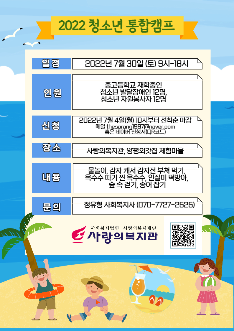 사랑의복지관에서 청소년 발달장애인들과 함께 캠프에 참여할 청소년 봉사자를 모집합니다.