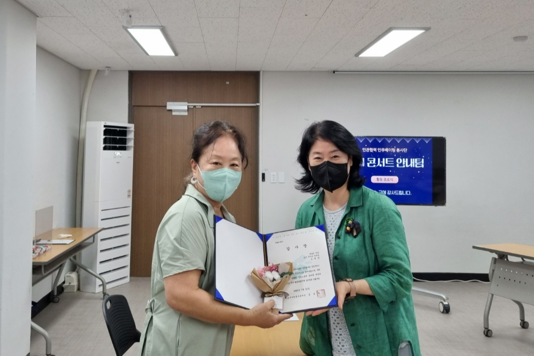 활동 종료식은 예술의 전당 11시 콘서트 송은영 단장님과 서초구자원봉사센터 김유미 센터장님의 인사말, 감사장 전달, 그리고 공지사항을 전달하는 순으로 진행이 되었습니다.