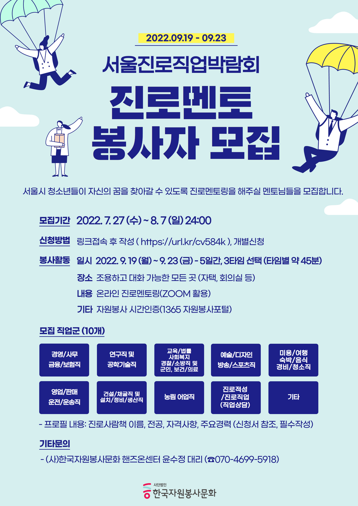 [모집]서울시자원봉사센터_현직자 어벤져스와 함께하는 직무멘토링, 청춘잡(Job)담(Talk) 홍보 (0) | 2022.05.10 |
