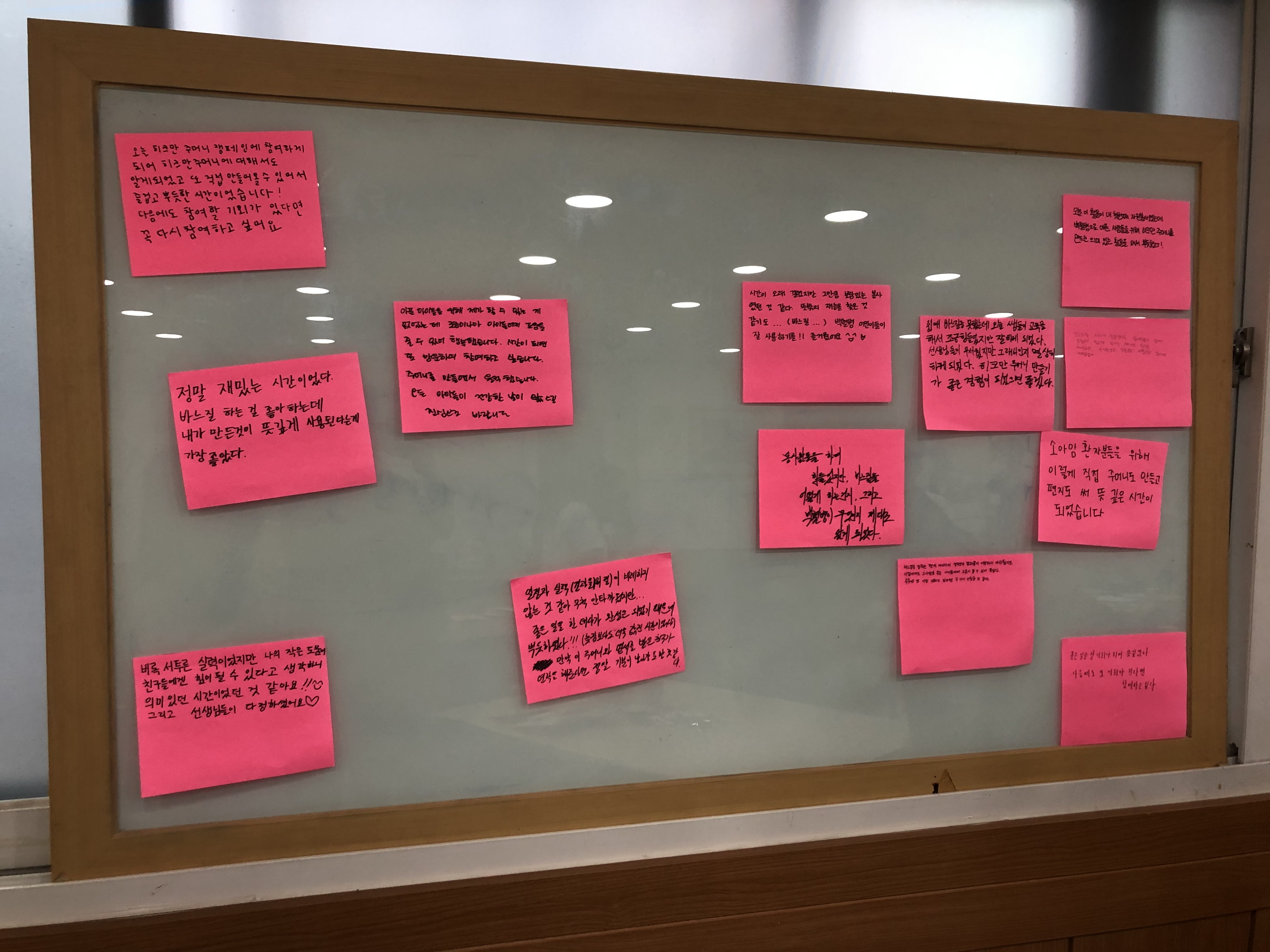 오늘 활동에서 제일 기억나는 것과 느낀 점을 포스트잇에 적어 모아보는 시간이였습니다.