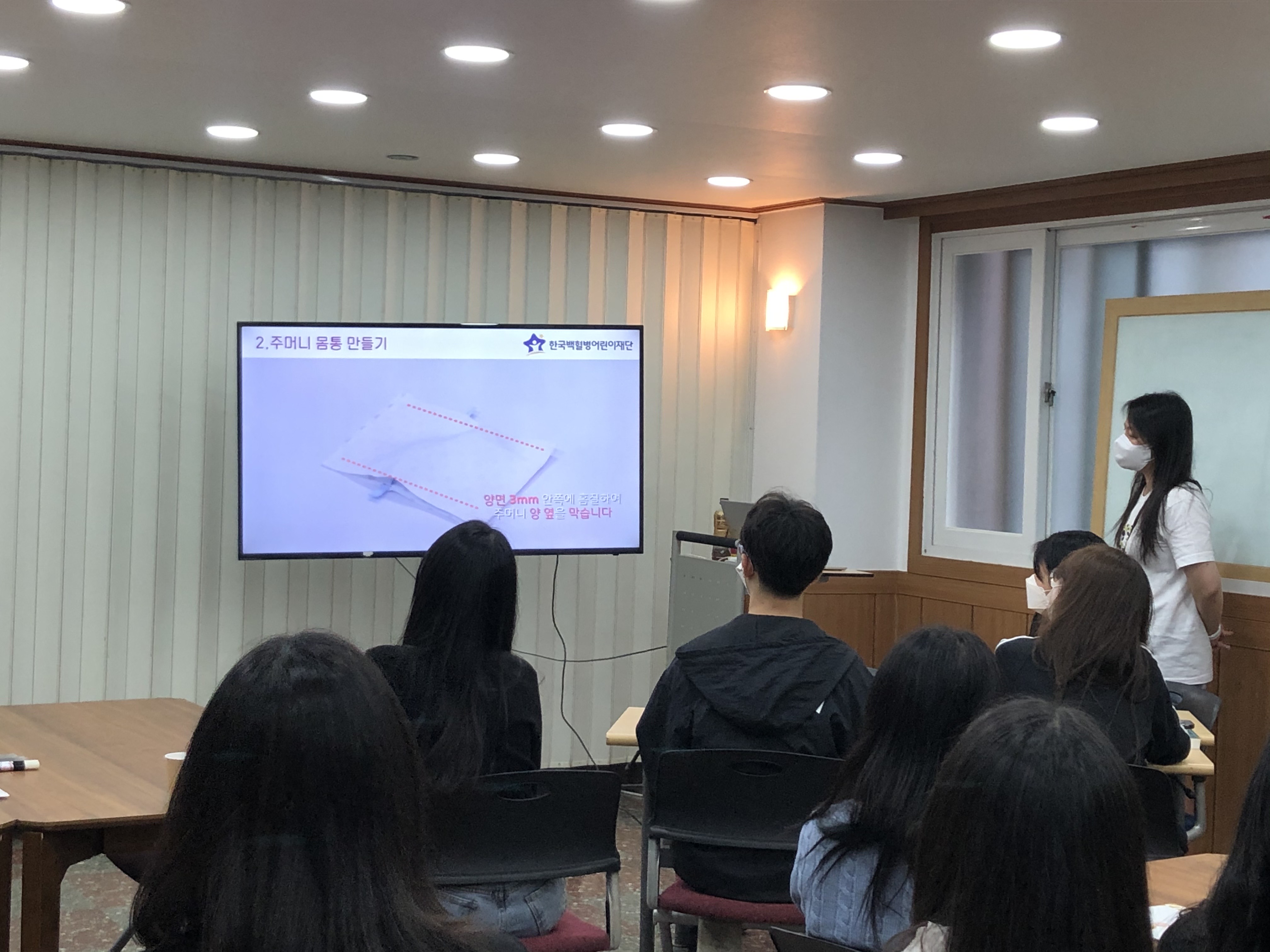 이번에 진행된 활동은 청소년들의 여름방학 봉사활동으로 소아암 환자에게 전달할 히크만 주머니를 만드는 활동입니다.