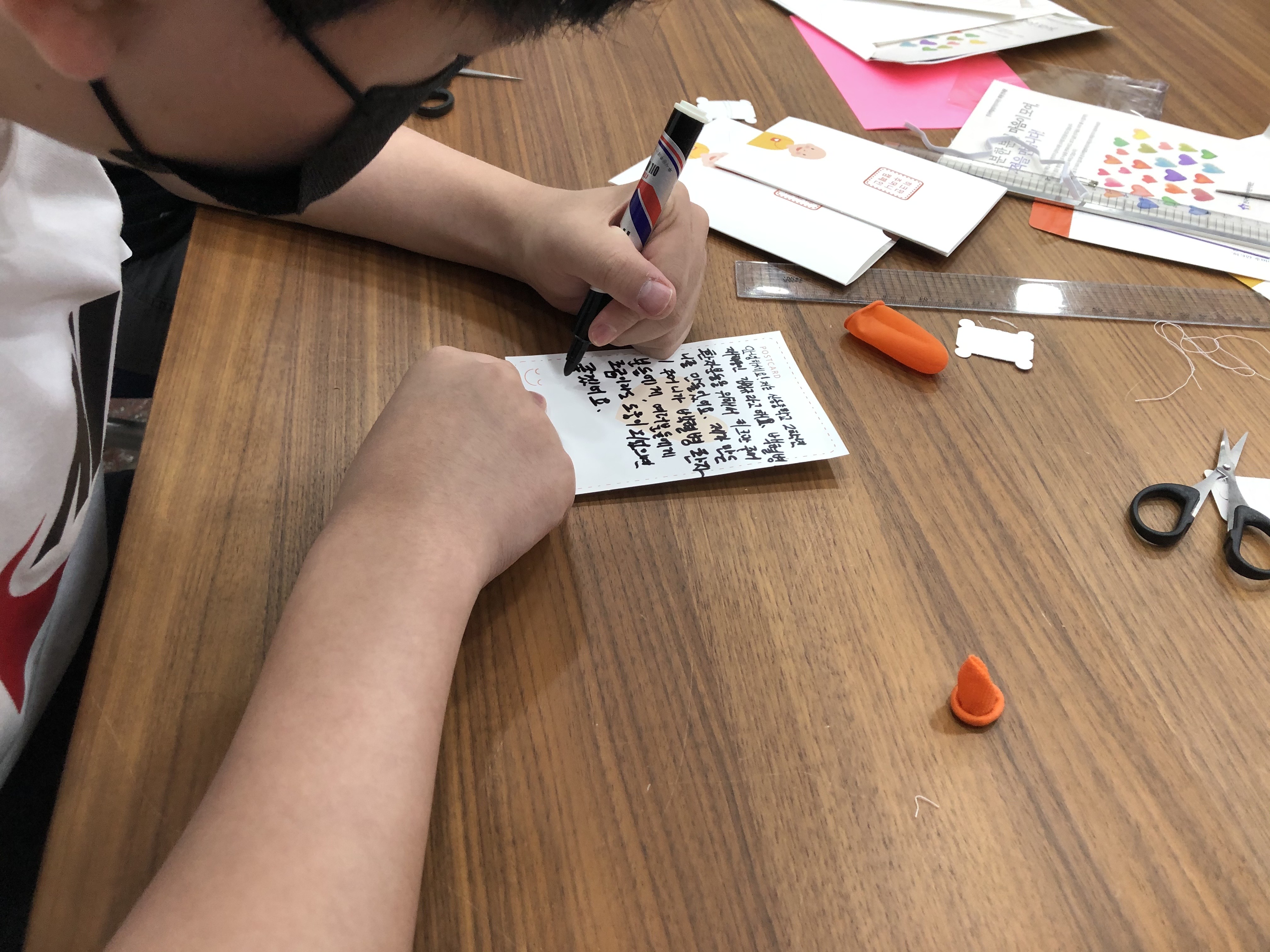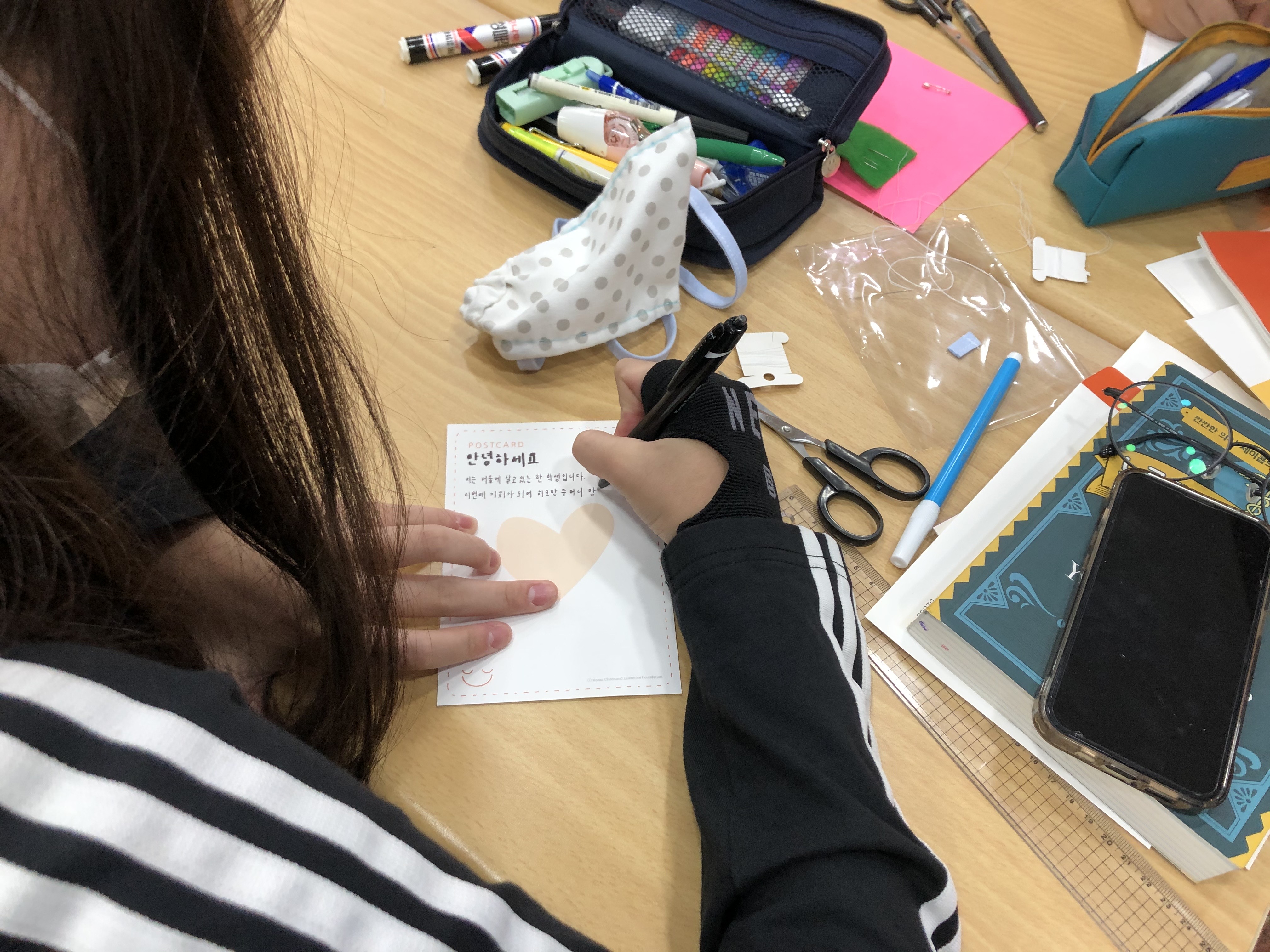 히크만 주머니를 만든 후에는 소아암 어린이들에게 주머니와 함께 전달할 메시지카드도 작성해봅니다.