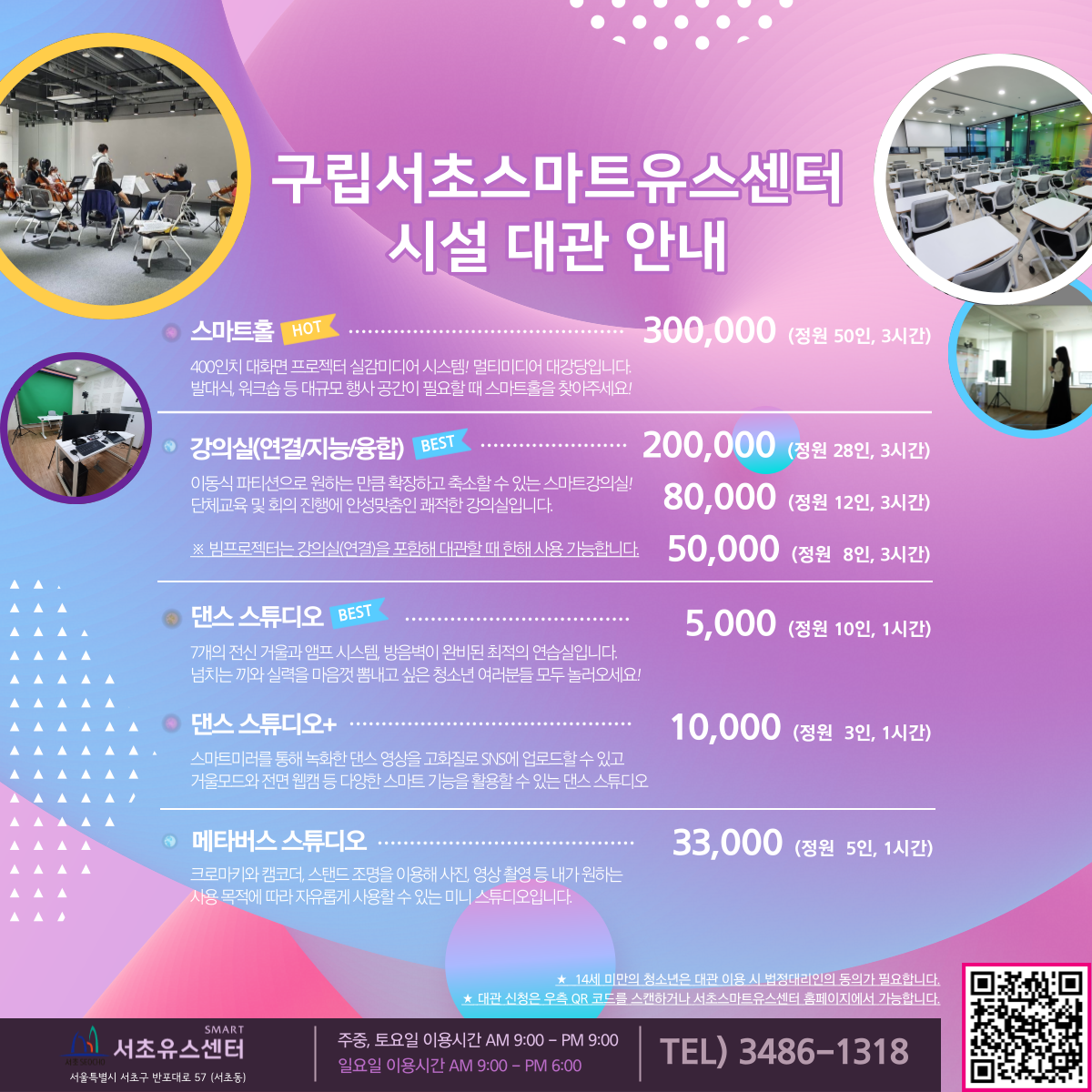 지난 12월 리모델링을 마친 서초스마트유스센터에서는 쾌적한 실내 댄스 연습실, 터치스크린 실감미디어월, 스마트 강의실 등을 포함한 최고의 시설물을 저렴한 가격으로 이용하실 수 있도록 시설 대관을 운영하고 있습니다.