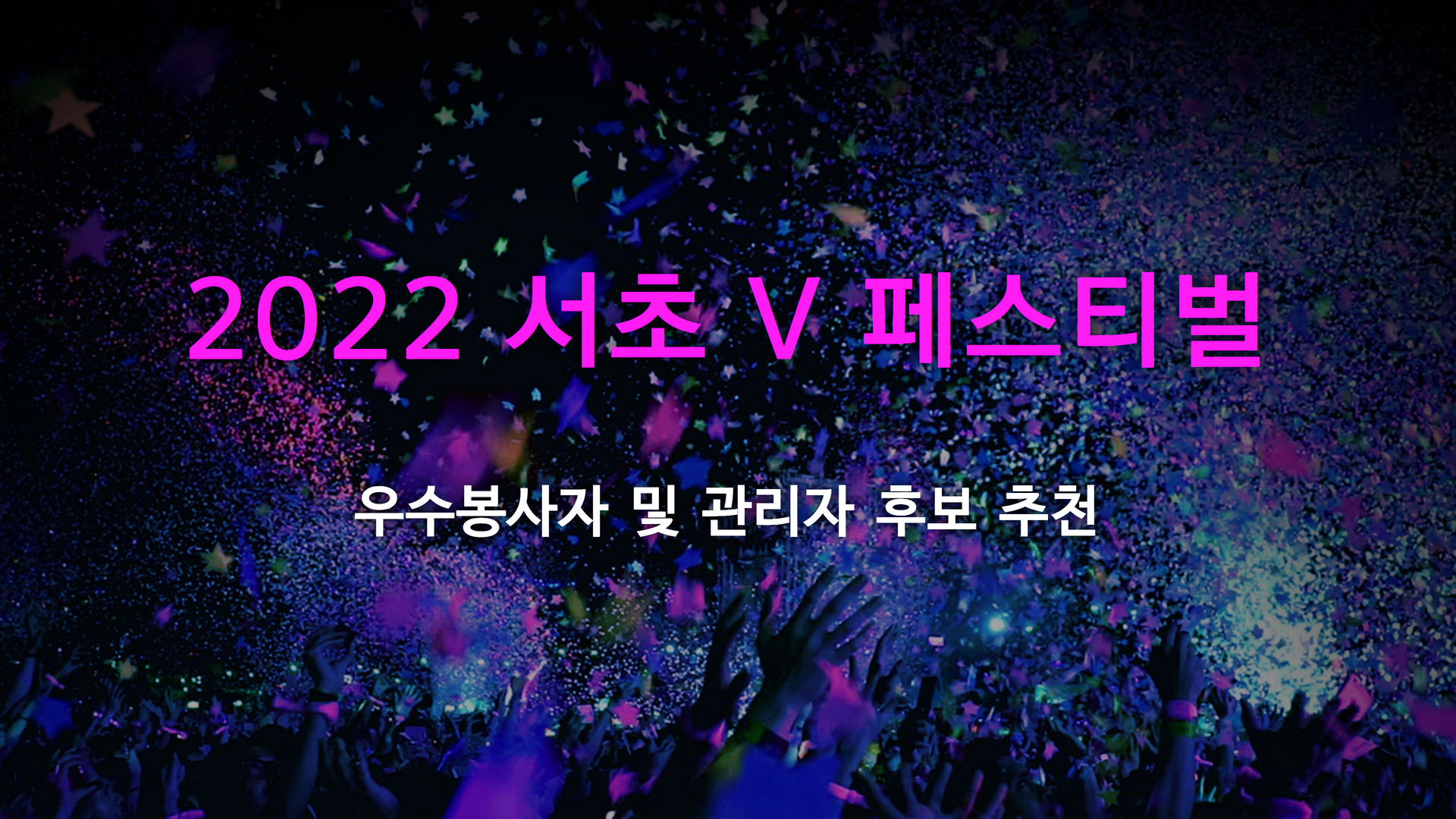 우리 센터에서는 자원봉사자들의 공로를 인정하고 활동을 축하하는 자원봉사자 연말대회인 <2022 서초V페스티벌>을 맞아, 자원봉사활동에 있어서 모범을 보인 자원봉사자(개인 및 단체) 및 자원봉사관리에 있어서 우수한 업무를 수행한 자원봉사관리자들을 격려하고 인정하는 시상을 마련하고자 합니다.