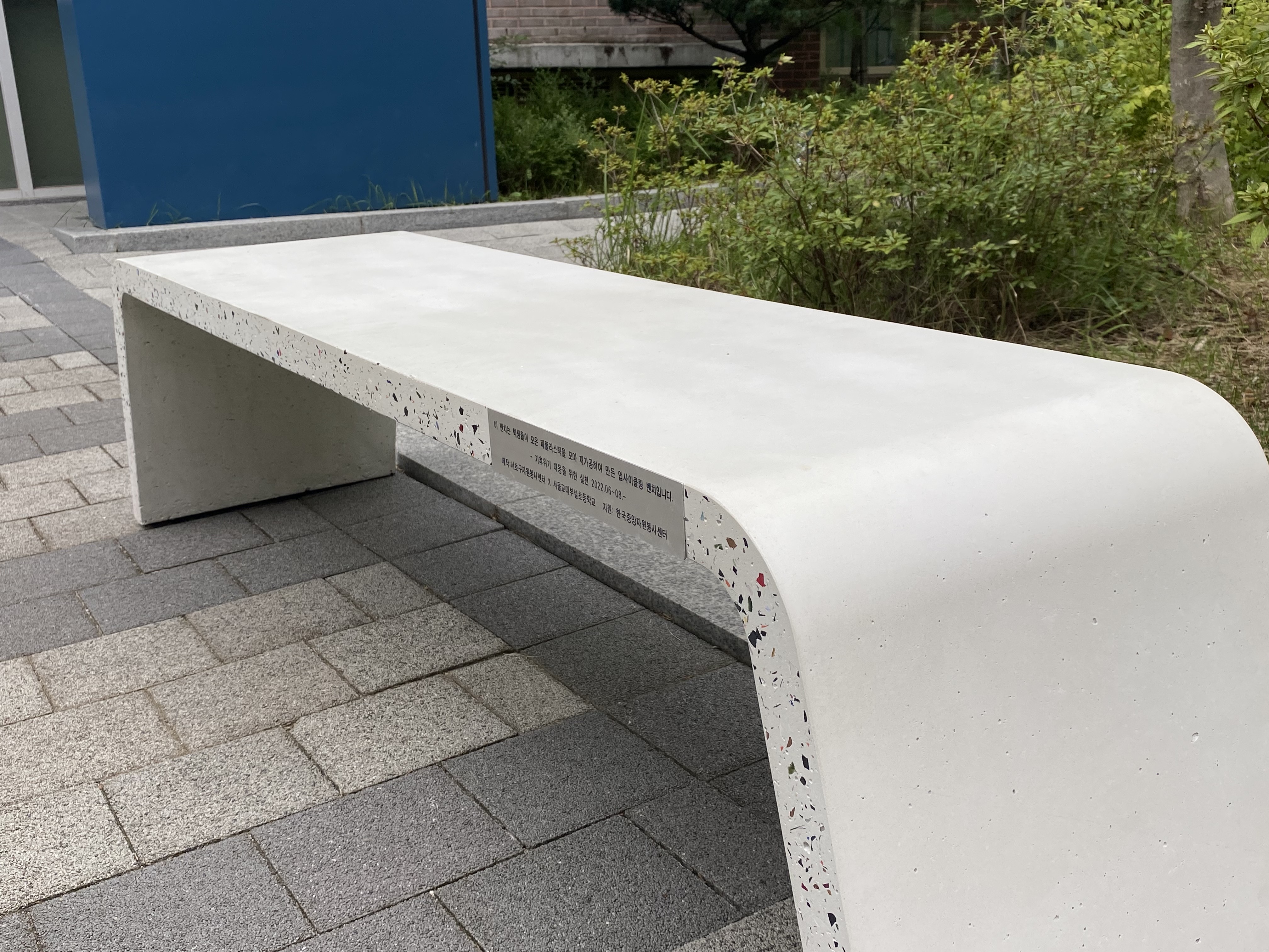 "이 벤치는 학생들이 모은 폐플라스틱을 모아 재가공하여 만들 업사이클링 벤치입니다."
