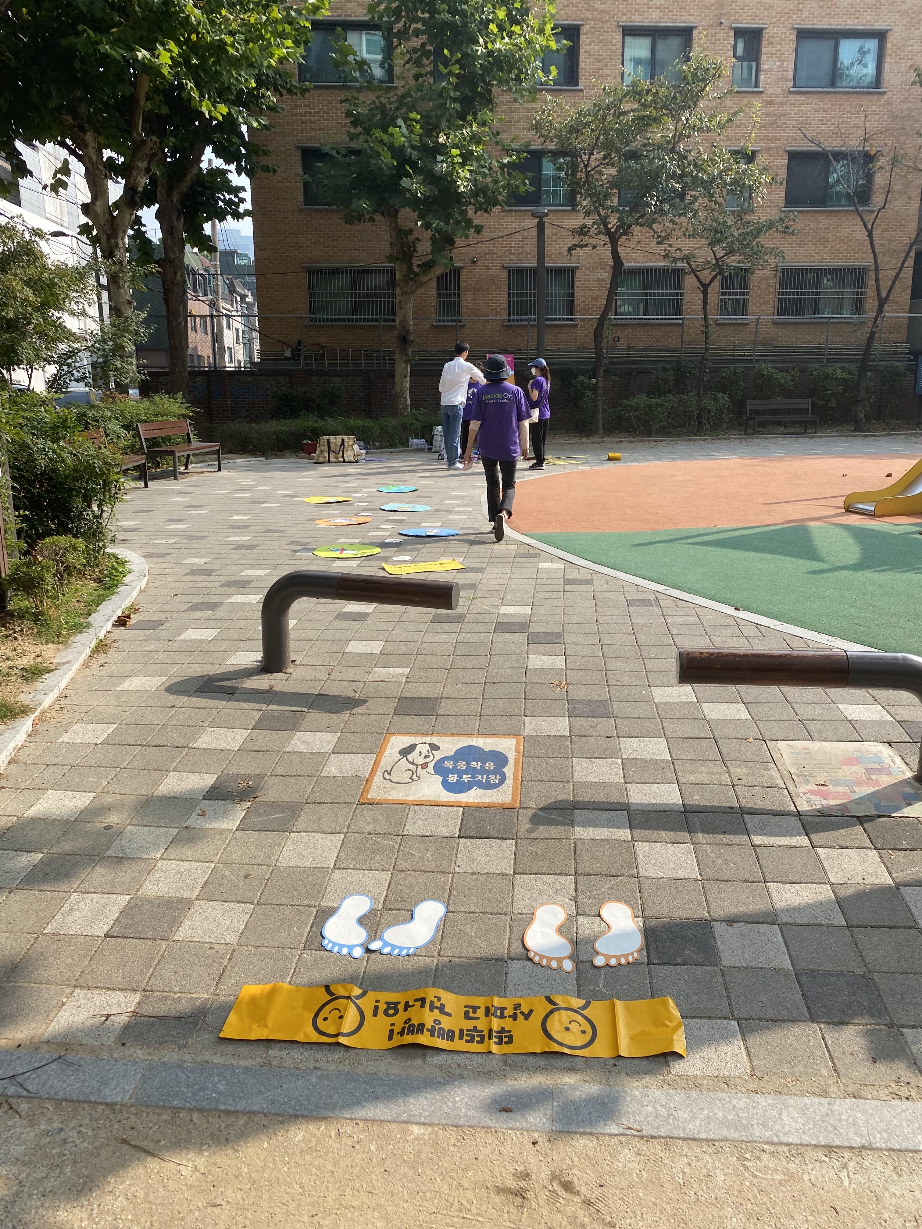 마을 공원에 ①환경보호 메세지를 담은 놀이감 조성과 ②안전한 놀이기구 사용을 위해 보수작업을 진행하는 활동이 진행되었습니다. [사업명: 지구시민을 위한 기후위기 예방 'PlayZone']