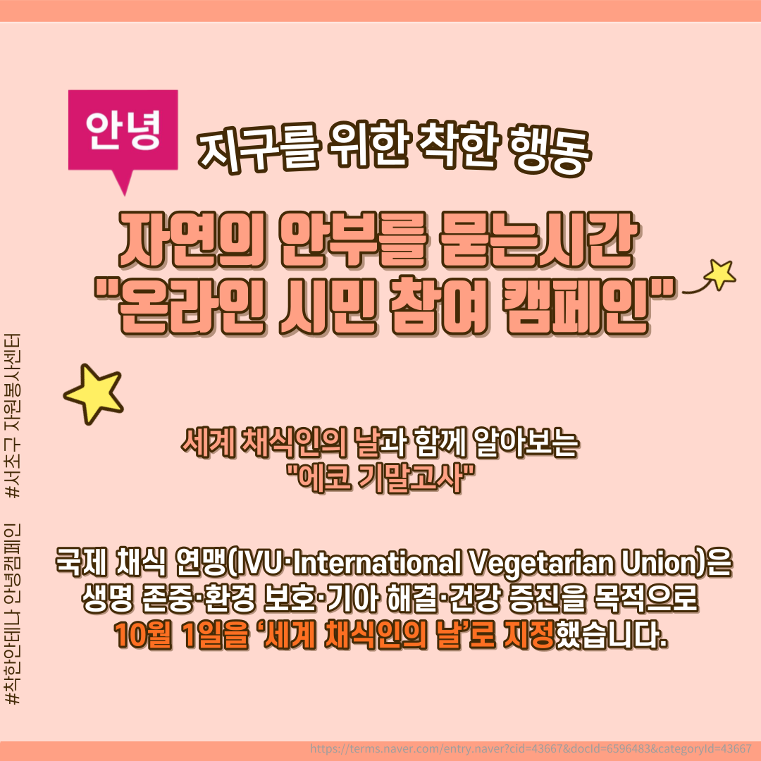 10월에 진행되는 온라인 안녕캠페인은, 10/1 채식인의 날을 맞이하여, 탄소중립을 주제로 진행되는 환경캠페인입니다!