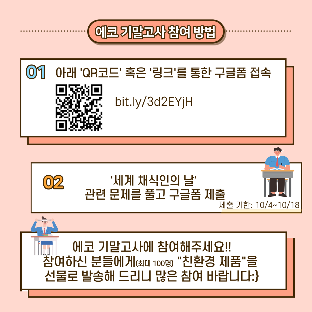 구글폼으로 문제를 풀며, 환경 지식도 채우고, 채식 위주의 식단으로 늘려나가시길 바랍니다.^^
